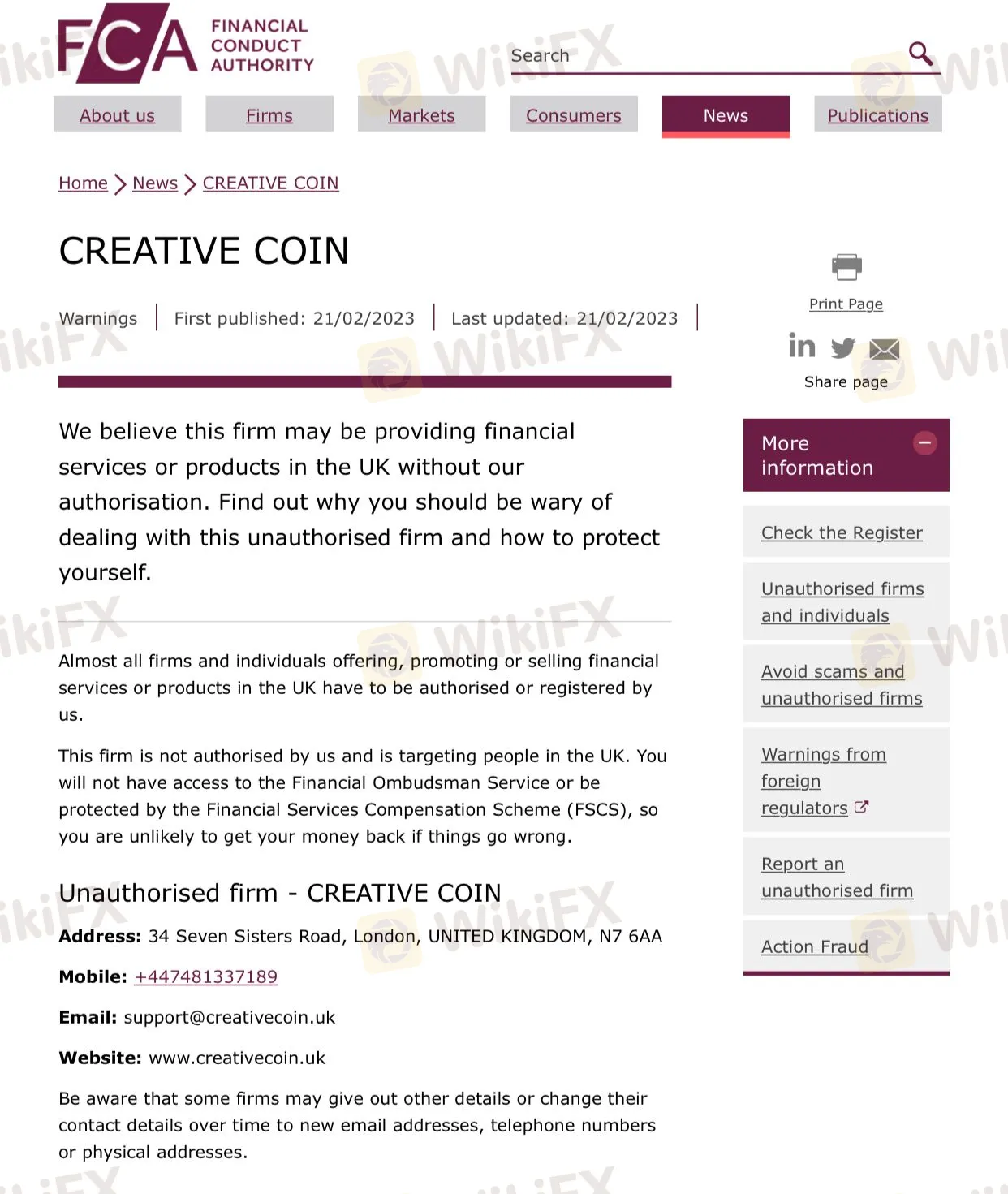 وفقًا لـ FCA ، لا يحق للوسيط تقديم خدمات مالية. في الواقع ، صرحت هيئة السلوك المالي (FCA) أنه ليس وسيط مرخص ، وبالتالي لن تحصل على أي حماية. تثبت مثل هذه التحذيرات بشكل شبه مؤكد أن شركة ما تقوم بنوع من عمليات الاحتيال - لذا امتنع عن اختيار الشركات المشبوهة التي حظيت بتقييم سلبي من السلطات المالية ذات السمعة الطيبة مثل FCA. الطريقة الوحيدة للتأكد من أن استثمارك في أيد أمينة وأنك ستعامل بإنصاف ووفقًا لجميع القوانين هي اللجوء إلى وسيط شرعي ومرخص.