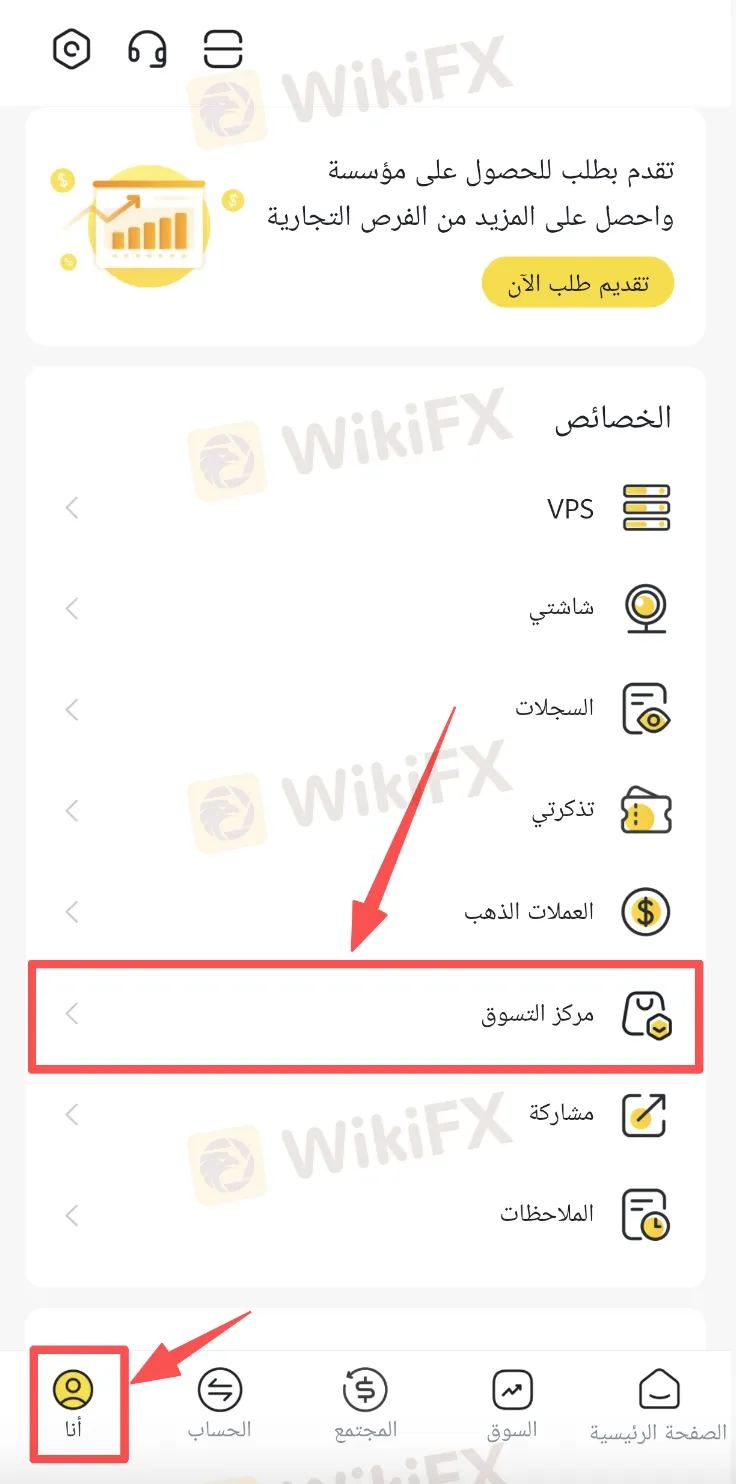 افتح التطبيق، واضغط على 【أنا】 في أسفل الصفحة، ثم ادخل إلى 【مركز التسوق】.