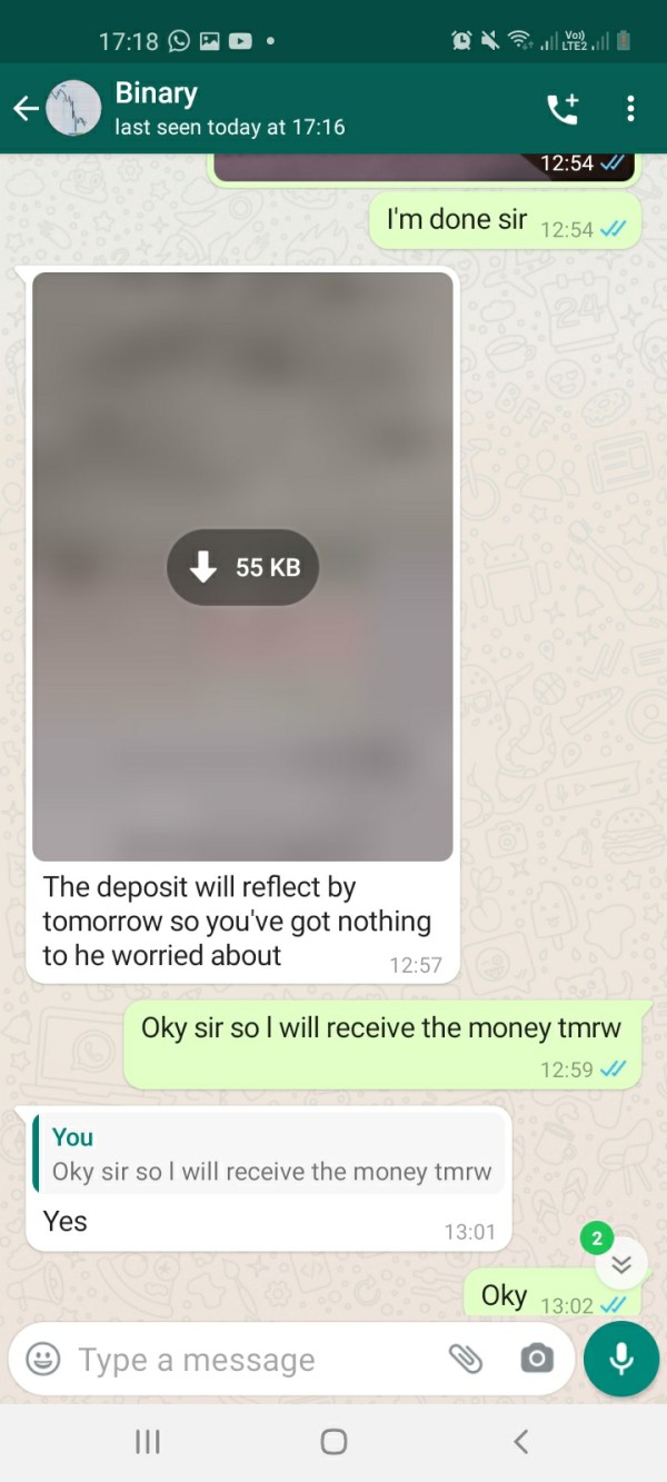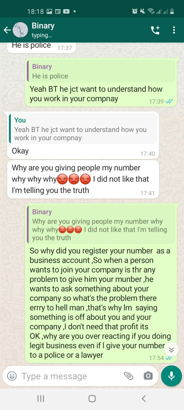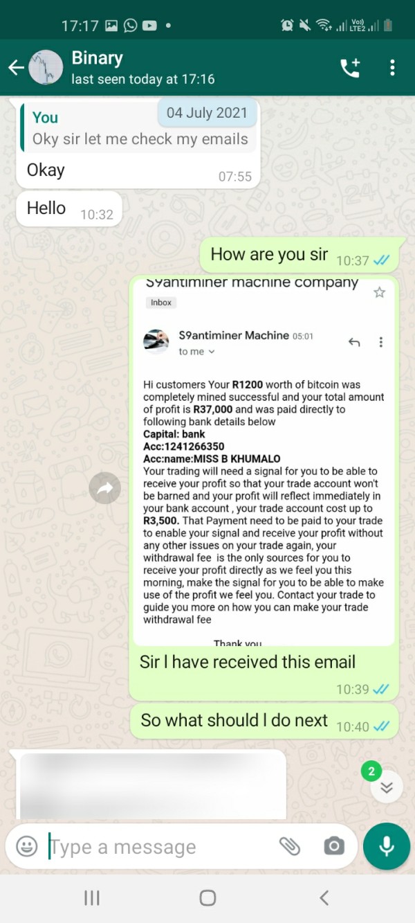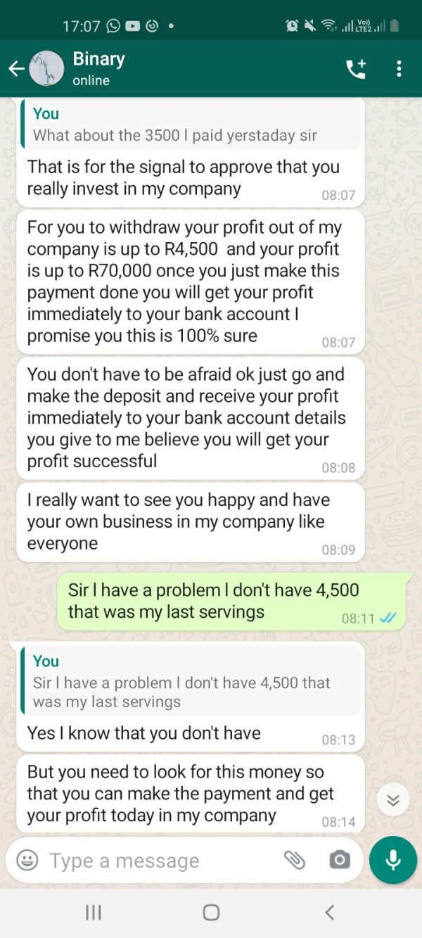 his name is Abhudhullai Usman we met on Facebook at the beginning of July and he told me about bitcoin and it was so convincing ,l joined by depositing 1000 for investing after that l made a profit and the company send email that l should pay 3500r and receive my profit ,l did exactly that and waited to receive the profit BT next day l was told that l need to pay another 4500 guys .that's when l realise that this is a scam .guys becare full out thre with your money don't jct send to strangers..