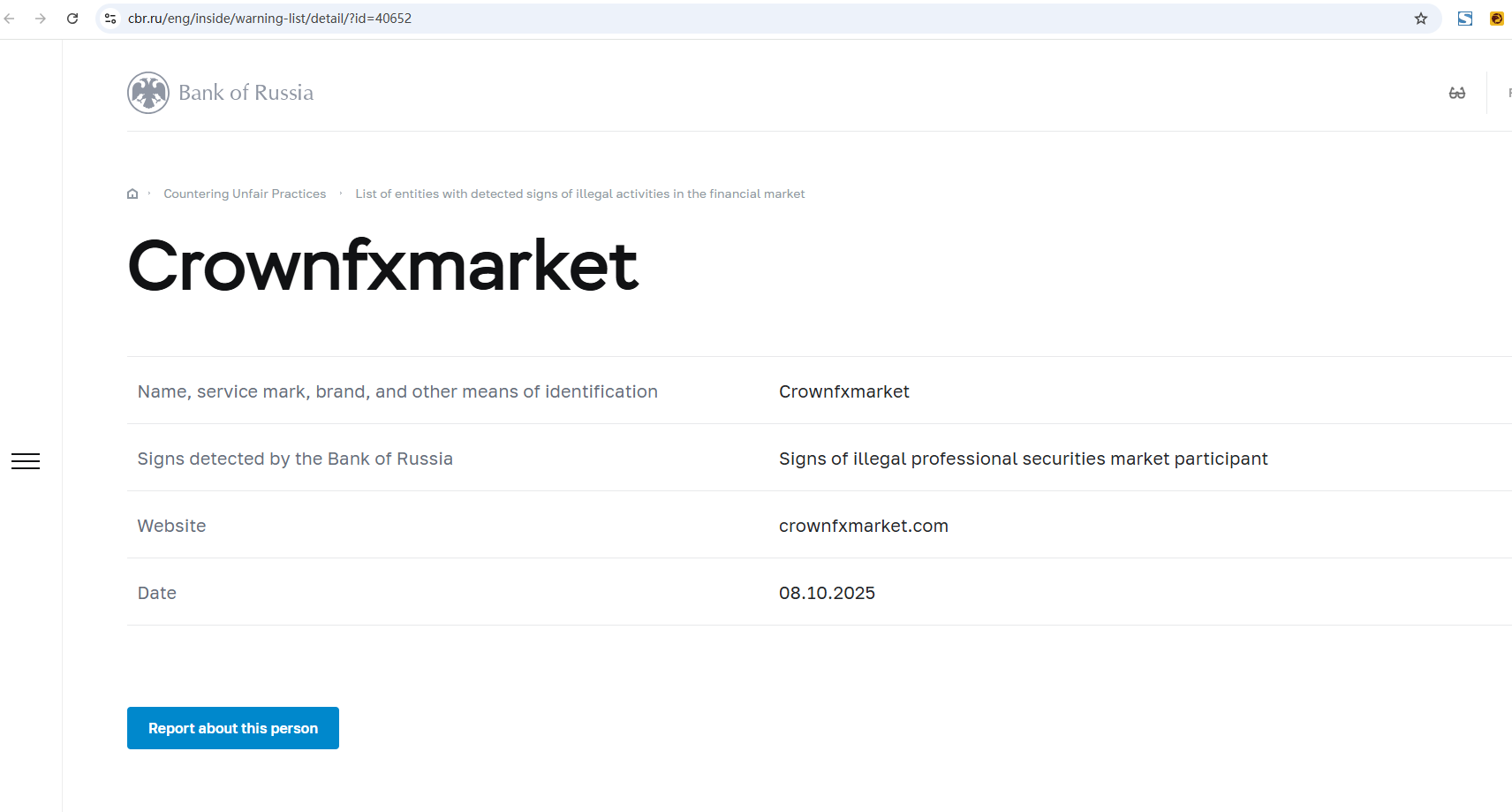 Name, Dienstleistungsmarke, Marke und andere Identifikationsmittel Crownfxmarket Vom Bank von Russland erkannte Zeichen Anzeichen eines illegalen professionellen Wertpapiermarktteilnehmers Website crownfxmarket.com Datum 08.10.2025