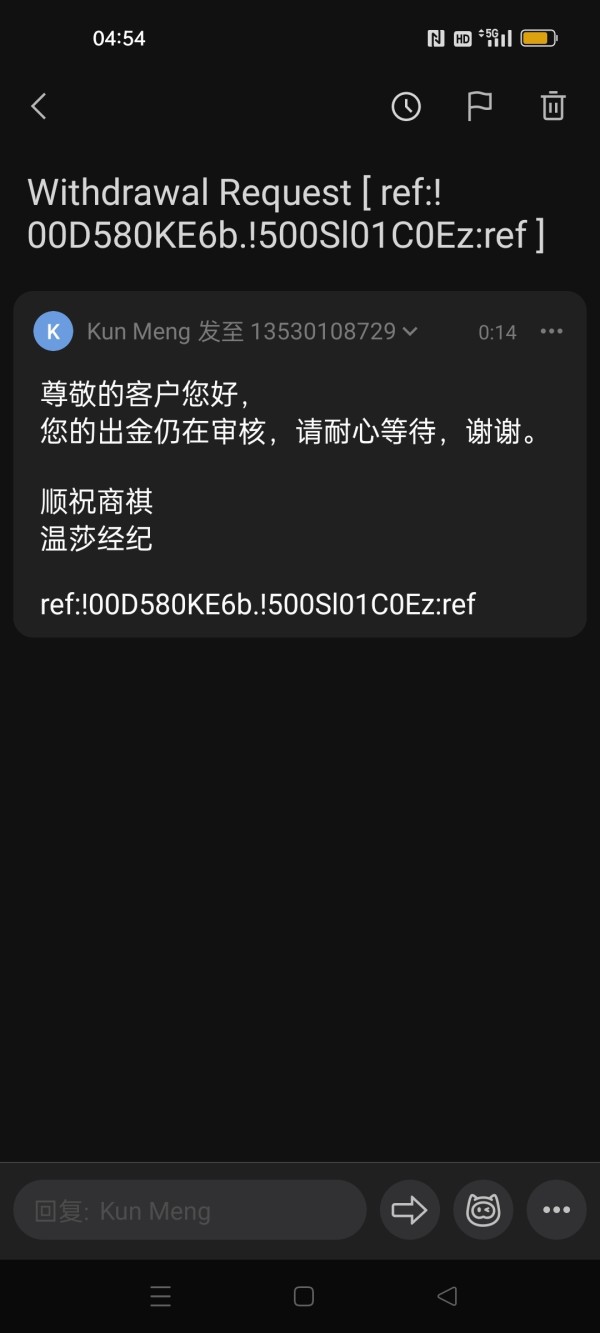 从上周开始,温莎出金申请一直都是拒绝状态,拒绝原因没有任何说明,这对我来说体验感太差了!我账户有2755美金,在申请出金。一直是待定!这平台这么不靠谱吗?