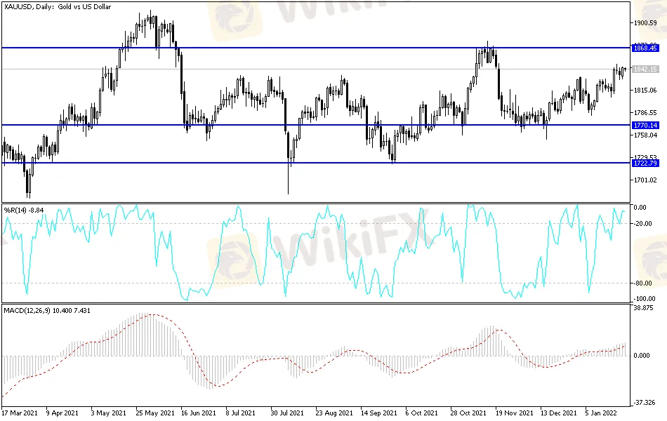Abstract:During the beginning of this week's trading, gold prices continued to rise, as investors sought to buy safe assets amid intense selling in global stock markets. Accordingly, the price of an ounce of gold moved to the level of 1845 dollars, which is stable near it at the time of writing the analysis. Escalating tensions between the United States and Russia over the Ukraine issue, and fears of monetary policy tightening by the Federal Reserve led to a sell-off in global equities.