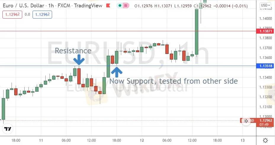 You can also use this concept if the market leaves a trading range and momentarily tests the broken range from the other side. The level flips from support to resistance (for short trades), or from resistance to support (for long trades).