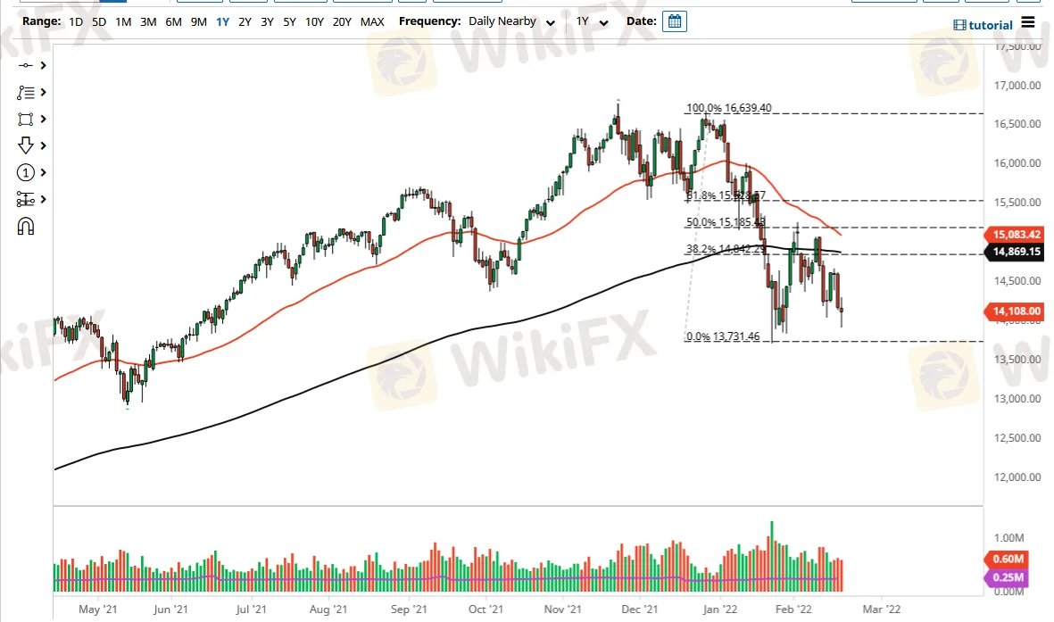 That being said, it is worth noting that the geopolitical concerns continue to be a major issue, and then we also have the specter of inflation. Both of those are negative things for growth stocks, which of course make up the bulk of what we see pushing the NASDAQ 100 overall. With this being the case, I do think that it is only a matter of time before we sell off again, but we may get a short-term relief rally. Keep in mind that bearish markets tend to have nasty recovery rallies from time to time, so it could be rather impressive in the short term. That being said, I still think that the 200 day EMA will offer a significant amount of resistance near the 14,869 level, so it is going to be difficult to get above there. With this, I am looking for rallies that I can fade on signs of exhaustion, as the market will continue to be one of concern more than anything else.