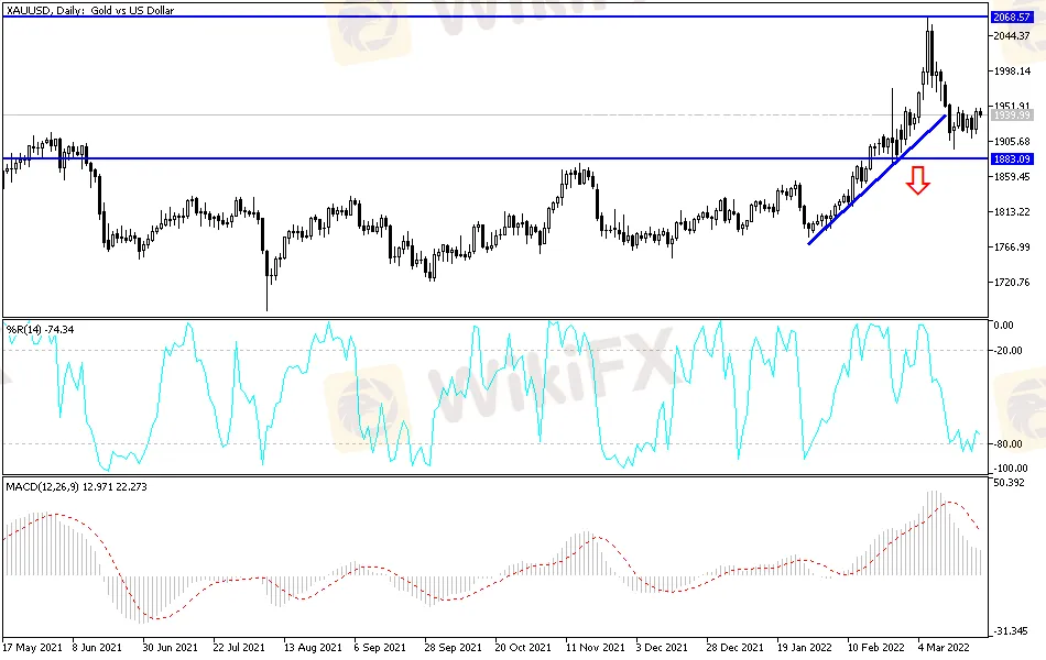 Despite the strength of the US dollar, gold prices rose to the resistance level of 1945 dollars an ounce and is stable around it at the time of writing the analysis. The recent selling of gold did not exceed the support level of $ 1911 an ounce, and gold gains came as weakness in global markets amid concerns about the Ukraine war and inflation increased demand for the safe-haven commodity. Earlier this week, Federal Reserve Chairman Jerome Powell suggested in a speech to the National Association of Business Economists that larger increases in US interest rates may be needed if inflation does not subside.