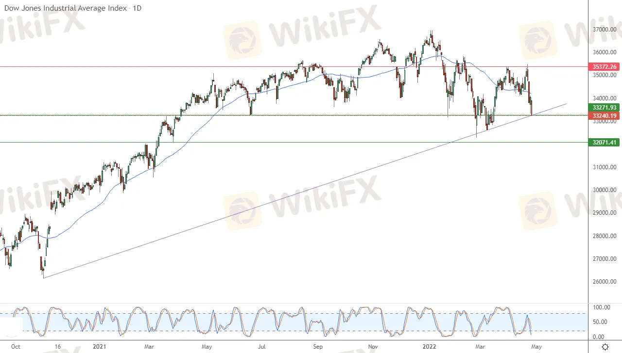 Therefore, our expectations suggest that the index will continue to decline during its upcoming trading, especially if it breaks the support level 33,271.90, to target immediately after that the first support levels at 32,071.40.