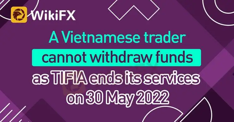 Abstract:Founded in 2014, TIFIA is an online broker headquartered in the Republic of Vanuatu but has offices in Thailand, Spain, Indonesia, and Nigeria. Recently TIFIA stopped its forex trading services on 30 May 2022 for some reason, which causes economic losses to its clients. One investor from Vietnam told WikiFX that he could not withdraw money from this broker since TIFIA stopped responding to him and providing any service. This victim eventually asked WikiFX for help. In this article, the victim exposed the process of how TIFIA took a trader’s money away without giving a proper reason.