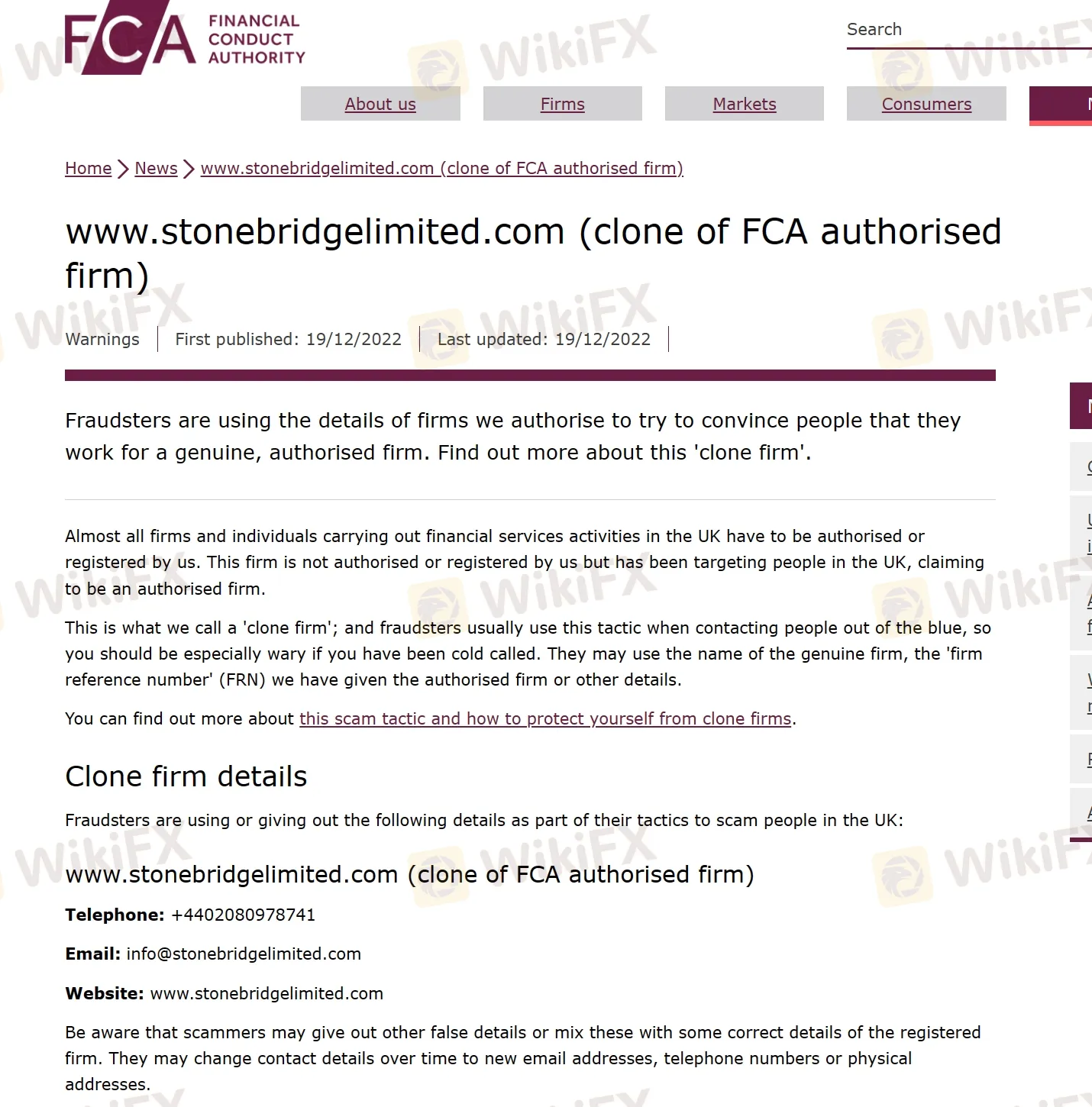 Breaking news! www.stonebridgelimited.com has come to the attention of the Financial Conduct Authority in the UK, which warned on December 19th that STONEBRIDGE has been pretending was authorized by us to offering its financial service. You may see the warning on the screenshot below.