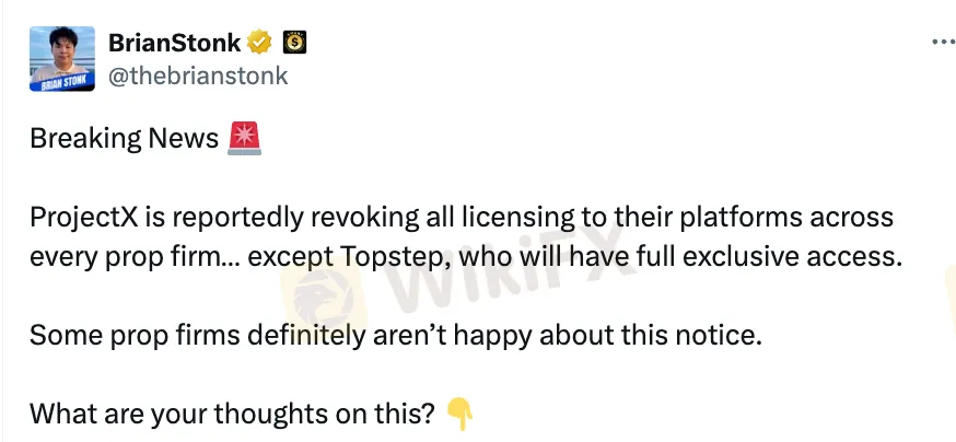 The news broke widely across social media and industry channels, highlighting that ProjectX is revoking licensing for its platforms across the board, with the sole exception of Topstep.