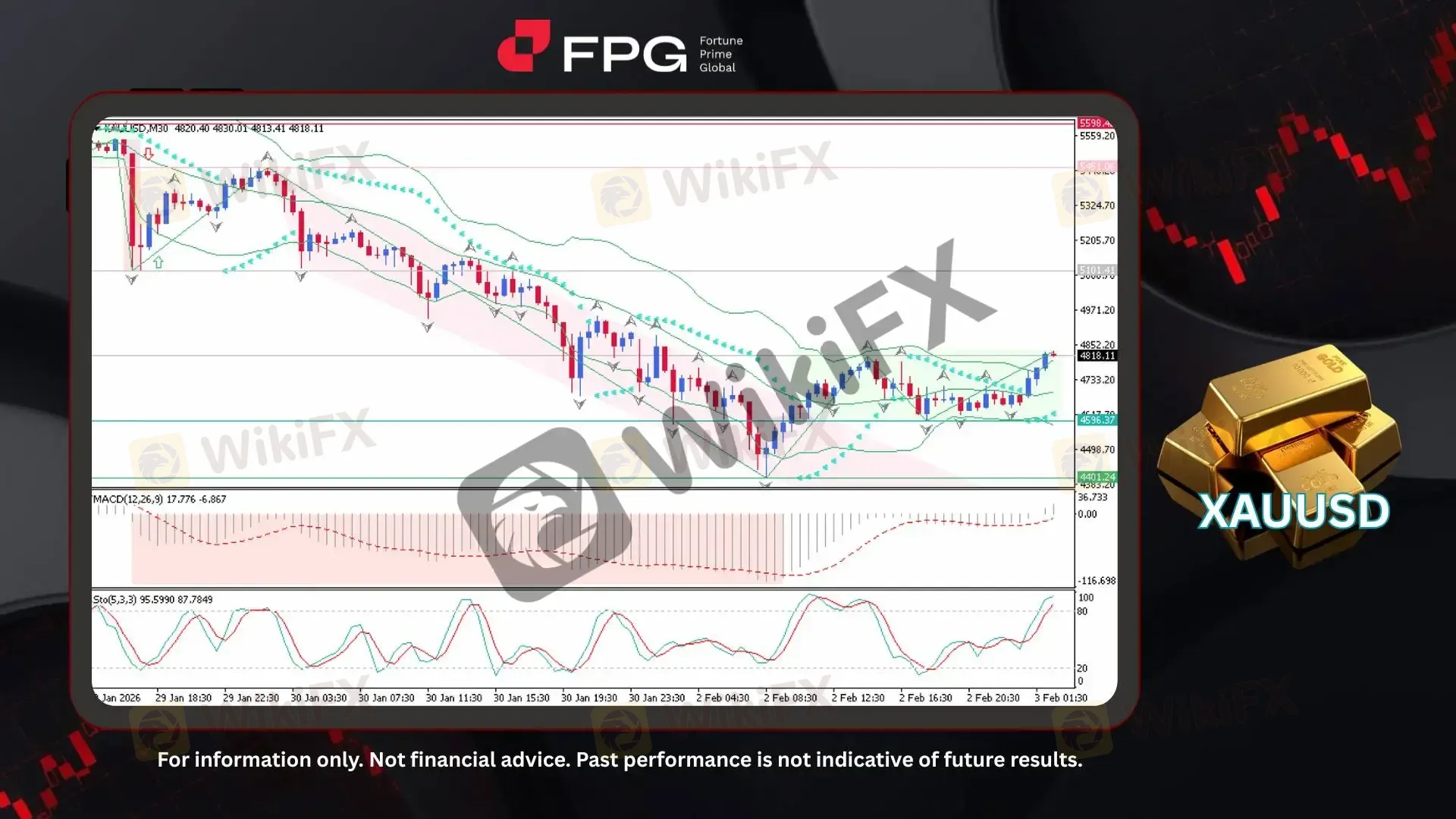 From an indicator perspective, Bollinger Bands remain relatively wide, reflecting the elevated volatility conditions, while price is fluctuating near the mid-to-upper band, suggesting short-term neutral to slightly bullish pressure within the range. Parabolic SAR dots have begun to appear closer to price, signaling a reduction in strong bearish momentum and a more balanced-bullish market structure. The MACD histogram is recovering from deeply negative territory, with momentum gradually improving, although it has not yet confirmed a strong bullish trend. Meanwhile, the Stochastic Oscillator is oscillating in the upper region, indicating strong short-term buying interest but also warning of potential pullbacks if overbought conditions persist.