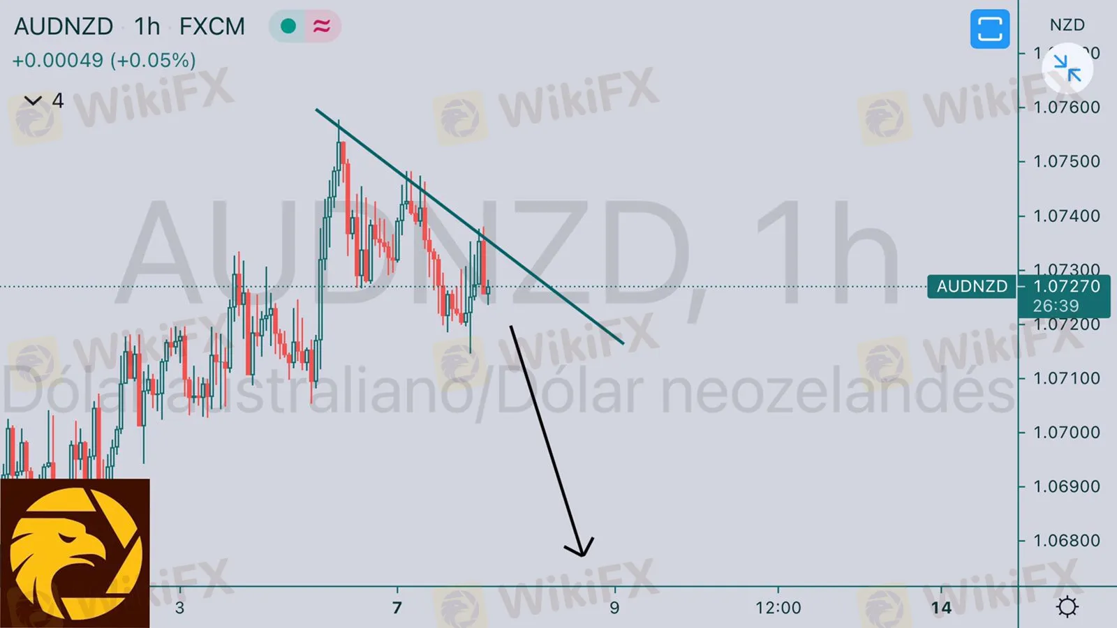 AUDNZD vemos una línea de tendencia fuerte a la baja con patrón de bandera, es momento de una oportunidad a la baja a partir del precio 1.07200