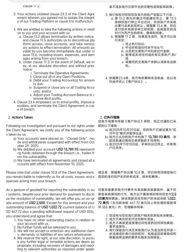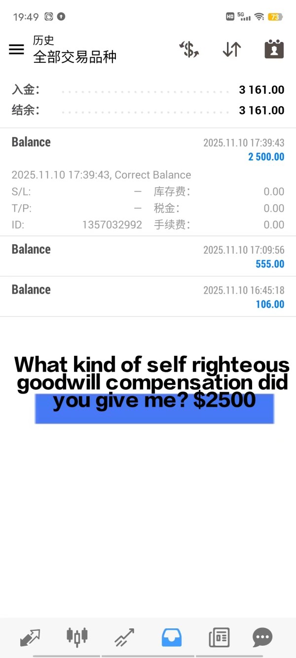 Ang pag-order sa FXTM ay maaaring mag-overlap, halimbawa, sa iyong account ay mayroon lamang 800 na margin, ayon sa kanilang prinsipyo, maaari ka lamang maglagay ng 1 lot ng ginto, ngunit dahil sa kanilang sistema ay minsan ay may pagkaantala o anuman, minsan ay may dalawang magkatulad na order na lumilitaw nang sabay, kaya bigla kang makakapasok ng 2 lots ng ginto nang sabay, na direktang magdudulot ng margin call, dahil sa ganitong pangyayari ay ilang beses na akong nagkaroon ng pagkalugi, ngunit hindi ko kailanman hiniling sa kanilang kumpanya na magbayad ng kompensasyon, noong 2025.10.27 ay sinubukan ko ang parehong produkto sa parehong presyo na naglagay ng dalawang order, at nalaman ko na ang kanilang sistema ay maaaring bumili nang sabay, hindi ito pagkakataon, at ang resulta ay ako ay nagkaroon ng pagkalugi, muli kong sinubukan at nalaman na ang sistema ng inyong kumpanya ay talagang may ganitong problema, hindi ito pagkakataon. Noong 2025.10.28 ay nagpadala ako ng 6 beses na mensahe at email sa FXTM, na naglalahad ng problema sa sistema ng inyong kumpanya, at nagtanong kung mayroong gantimpala sa pagtuklas ng problema, Sana may 30w transaction points reward, ngunit ang FXTM ay hindi ako pinansin at diretsong tinanggihan. Hindi ako empleyado ng inyong kumpanya, kaya walang isyu ng libreng pagtatrabaho para sa kanila. At dahil hindi nila pinansin ang aking mga natuklasan, ibig sabihin ay walang problema sa kanilang sistema, normal ito, at kailangan lang sumunod sa mga patakaran ng kanilang sistema sa pag-order. Kaya't sumunod ako sa sistema at operasyon ng FXTM, at ginawa ang paraan ng operasyon nang paunti-unti, ganap na sumusunod sa inyong sistema at mga patakaran. Pagkatapos, nag-withdraw ako ng 2025.10.29 18000, ngunit tinanggihan ng FXTM ang aking withdrawal, at ibinalik ang halaga sa negatibong account, na nagdulot sa akin ng direktang pagkalugi ng 5760.88 USD, at lahat ng aking mga account ay na-lock, hindi makapag-trade o mag-withdraw, pwedeng mag-deposit lang. Sa panahong ito, maraming beses akong nakipag-ugnayan sa FXTM, ngunit patuloy silang hindi ako pinapansin. Noong 2025.11.3, direktang kinumpiska ng FXTM ang aking account {. 5} dolyar na Amerikano, ang account ay nananatiling naka-lock. Hanggang sa 11.10, ang kanilang kumpanya ay patuloy na hindi nakikipag-usap o nakikipag-ugnayan sa akin upang malutas ang isyu, at noong Nobyembre 10, bigla na lamang nilang winasak ang kasunduan nang walang konsultasyon, at nag-alok ng tinatawag nilang 'mabuting loob' na kompensasyon na 2,500 dolyar na Amerikano upang hamakin ako. Una, ang pagkakatuklas sa problemang ito ay hindi aksidente, ngunit resulta ng paulit-ulit at pangmatagalang mga transaksyon na nagdulot ng pagkawala dahil sa mga isyu sa sistema ng FXTM. Halimbawa, kung mayroong 800 dolyar sa account, dahil sa problema sa sistema, minsan ay isang standard order lamang ang maaari kong ilagay. Minsan, maaari nilang ulitin ang paglalagay ng parehong order, na nagdudulot ng liquidation. Pagkatapos ng ilang pag-uulit, napansin ko na ang sistema ng FXTM ay nagpapahintulot sa iyo na maglagay ng parehong order nang sabay, anuman ang iyong margin. Hindi ko kailanman hiniling sa FXTM na bayaran ang mga pagkalulong ito. Kung nais ng FXTM na pag-usapan ito, dapat ko bang itanong ang tungkol sa ganitong uri ng kompensasyon? Pangalawa, pagkatapos matuklasan ang problema, Agad nilang iniulat sa kumpanya ng FXTM. Ganap nilang binabalewala ang natuklasan ng kliyente, na nangangahulugang walang problema sa panig ng FXTM. Masasabi nating pinapayagan ng FXTM ang ganitong uri ng operasyon bilang normal na operasyon. Pangatlo, pagkatapos ng problema, ang FXTM ay nagdesisyon nang walang anumang komunikasyon, feedback sa email, o pag-uusap.