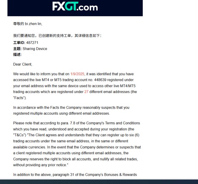 本人是FXGT用户(账号:448639),特此投诉贵平台在未提前告知、未提供合理解释的情况下,擅自删除我的账号,并扣除我账户内资金(资金:1957.11),严重侵害了我的合法权益。 一、事件经过 我注册成为贵平台用户,并按照平台规则进行了实名认证、人脸验证等操作。在使用期间,我一直遵守平台用户协议,未进行任何违规操作。 • 于2025年9月1日发现无法登录账号,登陆后台发现账号已经被删除了,而且没有任何通知的情况下 • 我通过工单要求平台提供证据,返还我的资金。但平台均以“系统自动风控”“违反平台规则”等模糊理由拒绝,且未提供任何具体违规证据。 二、投诉理由 1.无正当理由删除账号:平台在未提前通知、未提供明确违规证据的情况下单方面删除账号,违反了双方协议约定及公平原则。 2.拒绝出金侵犯财产权:账户内资金属于个人合法财产,平台无权擅自扣除或拒不返还。 3.客服推诿,缺乏解决诚意:多次沟通均未得到正面回应,平台逃避责任,严重损害用户体验和信任。 三、诉求 1.立即恢复我的账号,或提供明确的违规证据及删除账号的法律依据; 2.无条件返还我被扣除的资金 3.就此事件给予正式道歉,并改进平台规则及客服流程,避免类似问题再次发生。 四、后续行动 若贵平台继续无视用户权益,拒不解决问题,我将采取以下措施维护自身权益: • 向市场监管部门、金融监管部门等投诉举报; • 通过媒体、社交平台曝光此事 希望贵平台重视此事