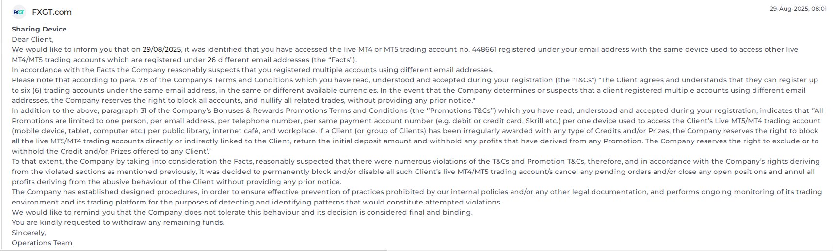 本人于近日在FXGT平台申请出金时,遭遇平台无理由拒绝,账户内资金被扣除,客服仅以“违规操作”为由搪塞,拒绝提供任何具体解释或证据。此举严重侵害投资者权益,本人在此公开经历,呼吁FXGT平台尽快放款,并提醒广大投资者警惕该平台风险。 事件经过 本人(账号;448661,)在FXGT平台进行交易已有一段时日,前期入金、交易等流程均正常。近日提交了一笔提款订单。然而,平台拒绝了我的提款订单,并从账户里扣除了我1256.54,剩下1028.58。就给我发了一个工单说怀疑我使用不同的电子邮件地址注册了多个账户,但这个账户是我自己独立的IP地址。本人立即要求客服提供具体理由和证据,但客服仅重复平台有权根据条款拒绝出金,无法给出任何实质性解释。 质疑与诉求 1. 无具体理由拒绝出金是否合理? FXGT平台在未提供任何证据的情况下,单方面认定用户“违规操作”,拒绝出金申请,缺乏透明度和公正性。若确实存在违规,平台有义务出示具体违规事实和依据,而非含糊其辞。 2. 资金安全如何保障? 投资者将血汗钱投入平台,是基于对平台的基本信任。FXGT平台的行为严重破坏了这种信任,令人质疑其资金管理和合规性。 本人要求FXGT平台: • 立即返还我账户的资金,允许正常出金; • 如坚持认定违规,需提供具体违规证据、相关条款依据及详细说明; • 若无法证明违规,需道歉并赔偿由此造成的损失。 下一步行动 本人将持续与FXGT平台沟通,若问题未解决,将向所在国家金融监管机构投诉,并考虑通过媒体、社交平台曝光此事。 希望贵平台重视此事