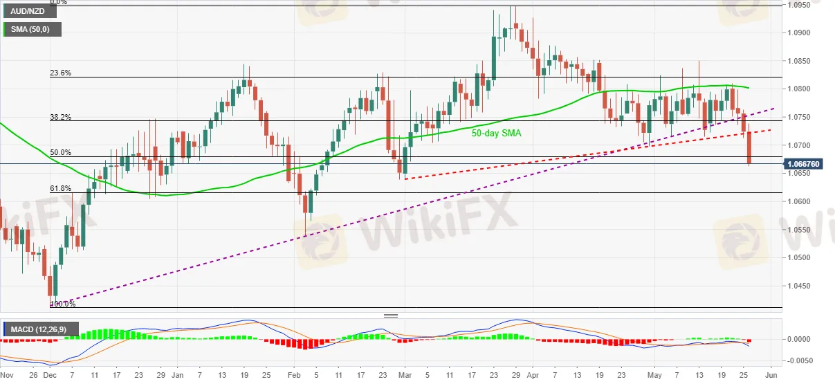 Balita sa Forex ng WikiFX (Ika-26 ng Mayo taong 2021) - Pagsusuri sa Presyo ng AUD/NZD : Ang mga slump sa ibaba 1.0700 habang tinutukso ng RBNZ ang pagtaas ng rate sa huling bahagi ng 2022.