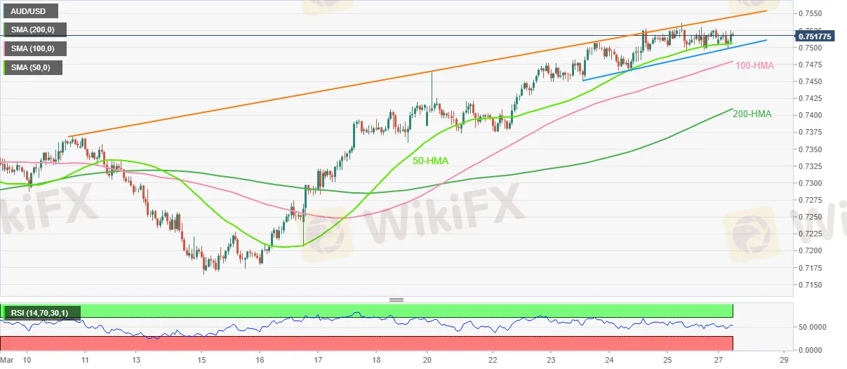 abstrak:AUD/USD bounce off 50-HMA upang ipagtanggol ang mga mamimili sa itaas ng 0.7500 threshold sa panahon ng Asian session ng Lunes. Iyon ay sinabi, ang pares ng Aussie ay nagpi-print ng banayad na mga nadagdag sa paligid ng 0.7520 sa oras ng press.
