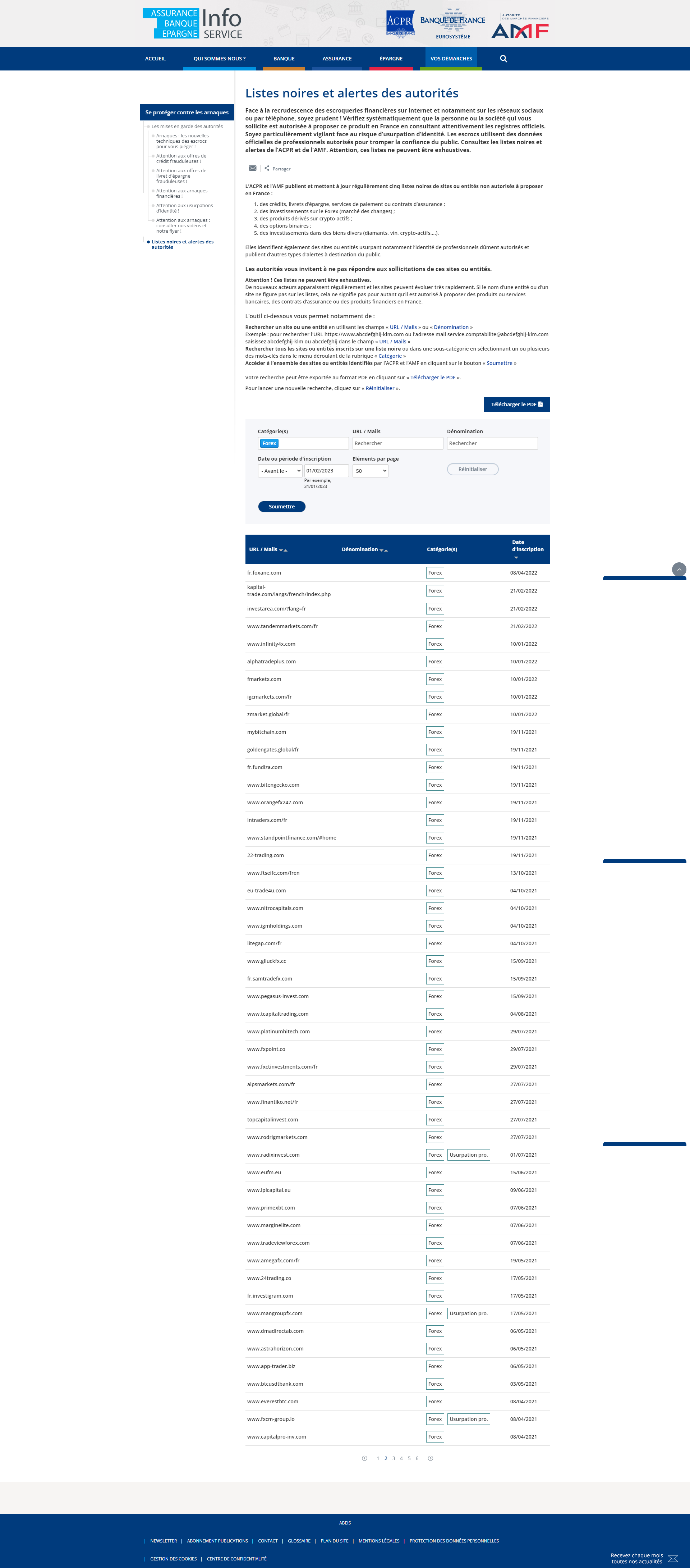 Listes noires et alertes des autorités Face à la recrudescence des escroqueries financières sur internet et notamment sur les réseaux sociaux ou par téléphone, soyez prudent ! Vérifiez systématiquement que la personne ou la société qui vous sollicite est autorisée à proposer ce produit en France en consultant attentivement les registres officiels. Soyez particulièrement vigilant face au risque d’usurpation d’identité. Les escrocs utilisent des données officielles de professionnels autorisés pour tromper la confiance du public. Consultez les listes noires et alertes de l’ACPR et de l’AMF. Attention, ces listes ne peuvent être exhaustives. L’ACPR et l’AMF publient et mettent à jour régulièrement cinq listes noires de sites ou entités non autorisés à proposer en France : des crédits, livrets d’épargne, services de paiement ou contrats d’assurance ; des investissements sur le Forex (marché des changes) ; des produits dérivés sur crypto-actifs ; des options binaires ; des investissements dans des biens divers (diamants, vin, crypto-actifs,...). Elles identifient également des sites ou entités usurpant notamment l’identité de professionnels dûment autorisés et publient d’autres types d’alertes à destination du public. Les autorités vous invitent à ne pas répondre aux sollicitations de ces sites ou entités. Attention ! Ces listes ne peuvent être exhaustives. De nouveaux acteurs apparaissent régulièrement et les sites peuvent évoluer très rapidement. Si le nom d’une entité ou d’un site ne figure pas sur les listes, cela ne signifie pas pour autant qu’il est autorisé à proposer des produits ou services bancaires, des contrats d’assurance ou des produits financiers en France.