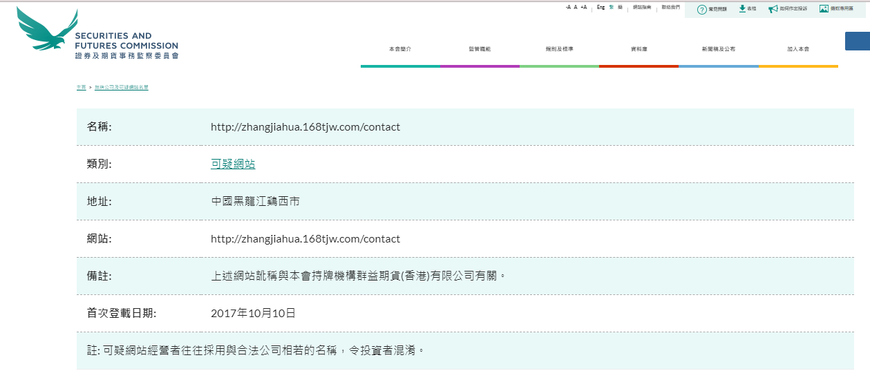 Nom : http://zhangjiahua.168tjw.com/contact Catégorie : Site Web suspect Adresse : Ville de Jixi, Heilongjiang, Chine Site Web : http://zhangjiahua.168tjw.com/contact Remarques : Le site Web ci-dessus prétend à tort être affilié au groupe d'organisation sous licence de l'association Yi Futures (Hong Kong) Co., Ltd. Date de première publication : 10 octobre 2017 Remarque : Les opérateurs de sites Web suspects utilisent souvent des noms similaires à des entreprises légitimes, ce qui déroute les investisseurs. " La liste des entreprises non autorisées et des sites Web suspects répertorie les entreprises qui ne sont pas autorisées à Hong Kong et qui ont attiré l'attention de la SFC. Ces entreprises sont soupçonnées d'être ou ont fait du marketing auprès d'investisseurs de Hong Kong, ou prétendent avoir des liens avec Hong Kong. Vous pouvez effectuer une recherche par nom ou par catégorie pour voir si une entreprise figure sur la liste. Cette liste n'est pas exhaustive. Comme le SFC trouve souvent des entreprises ou des sites Web importants, de nouveaux sont ajoutés à la liste de temps en temps. Si vous avez été approché par une entreprise non agréée, veuillez utiliser notre formulaire de plainte en ligne. Pour plus d'informations sur les chaufferies, les sites Web frauduleux et les e-mails de phishing, veuillez cliquer sur les liens correspondants. REMARQUE : La liste des entreprises non agréées et des sites Web suspects est destinée à émettre une alerte précoce aux investisseurs. Les investisseurs ne peuvent pas se fier uniquement aux informations contenues dans la liste ci-dessus, ils doivent vérifier attentivement les détails de chaque entreprise. Veuillez sélectionner la première lettre anglaise du nom de chaque colonne pour afficher la liste, ou cliquez sur "Nom chinois". la colonne parcourt les entreprises avec des noms chinois uniquement."
