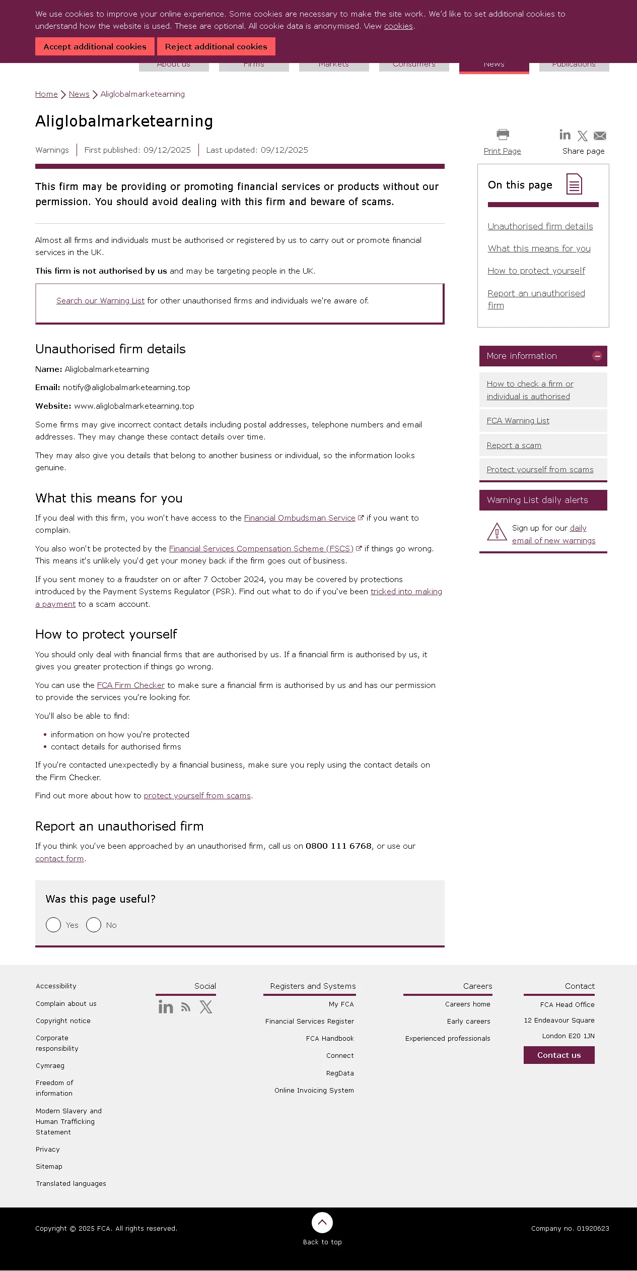 FCA Liste d'alerte des sociétés non autorisées Aliglobalmarketearning.