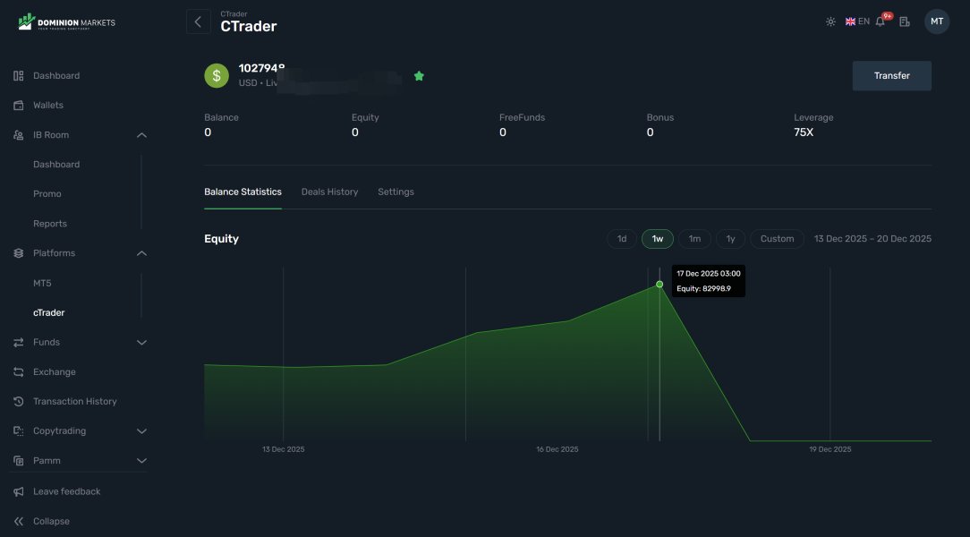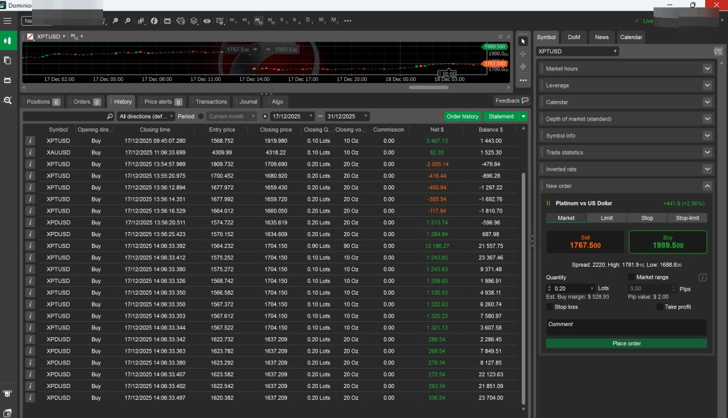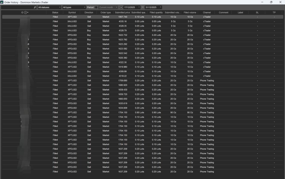I was a verified client of Dominion Markets since November 25, 2025. My trading was going well; I went long XPTUSD and XPDUSD and watched my account grow. But on December 17, 2025, they logged into my trading account and closed my winning trades themselves, increasing the spread by $200 on XPTUSD. The actual closing price should have been around $1,911, but they closed my positions at $1,660-$1,704. They also closed my account. Because of this, I lost $67,310. They didn't notify me of this; instead, I messaged them all day, but they ignored me. I believe they did this intentionally to steal my profits. I have screenshots to prove this. There are also many negative reviews about their activities, including how they block accounts and prevent people from withdrawing their funds. I recommend everyone stay away from this company to avoid giving a penny to these scammers. How can they be held accountable?