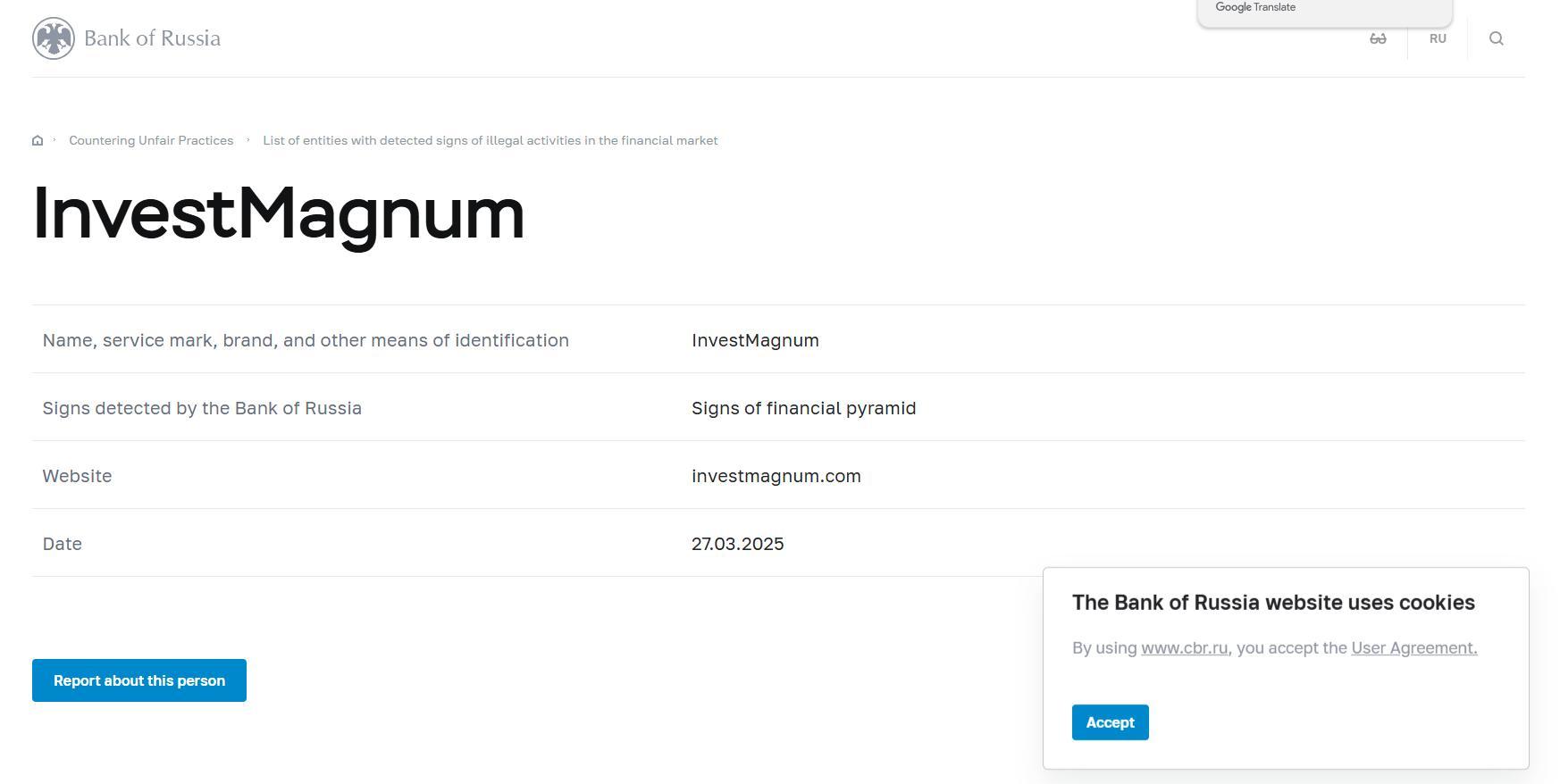 वित्तीय बाजार इन्वेस्टमैग्नम में अवैध गतिविधियों के पाए गए संकेतों वाली संस्थाओं की सूची.