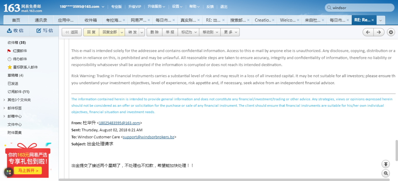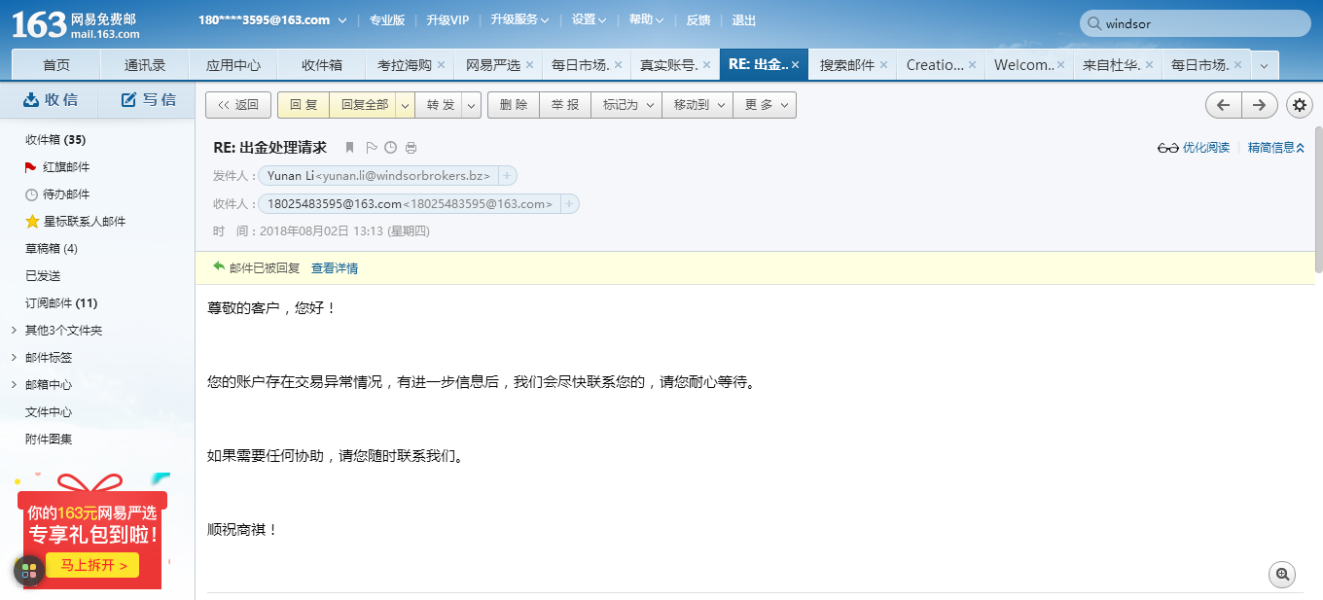 本人杜先生,账号55901,本人于七月2号开始开户入金交易,入金5930美金,我总共下了73手,其中的单子有亏有盈,最后是赚了2243美金,温莎客服就告知我说,我的账户异常交易,不能继续交易,只能出本金,我当时真的很懵,难道这么大的一家公司,居然连2243美金都亏不起?客户才赚那么一点钱都不给,那为什么还要打开门做生意?我已经确定的是温莎经纪在上海和广州有办事处,但是没有具体的地址,我一直在寻找,希望大家帮帮忙,我想报案立案,就算那点钱拿不回来我都不在乎,只希望大家都能看得到,不要再被温莎经纪给欺骗了。正常的盈亏我都能接受,但是随便污蔑子虚乌有的东西,我不背,我决定和温莎经纪周旋到底,希望有人能够助我一臂之力,谢谢大家。