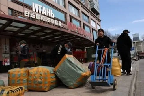 Foto: Pria memindahkan tas barang untuk ekspor di depan pusat perdagangan yang menampung toko dan kantor dengan barang dan jasa Rusia, di Beijing, Cina, 1 April 2022.