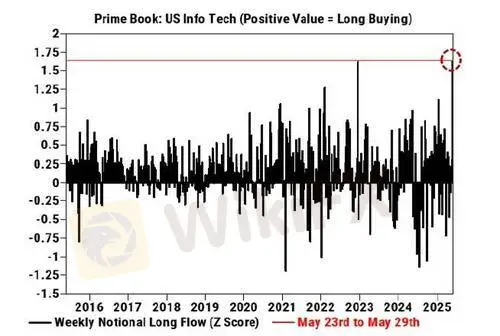 Faktor penting lainnya adalah perubahan struktural dalam strategi alokasi aset. Menurut laporan posisi hedge fund terbaru dari Goldman Sachs, sektor teknologi informasi AS mengalami arus beli bersih selama tiga minggu berturut-turut, bahkan mencatat pembelian setiap hari perdagangan pekan ini. Kuatnya minat beli ini telah mendorong posisi long nominal sektor teknologi ke level tertinggi dalam lebih dari satu dekade.