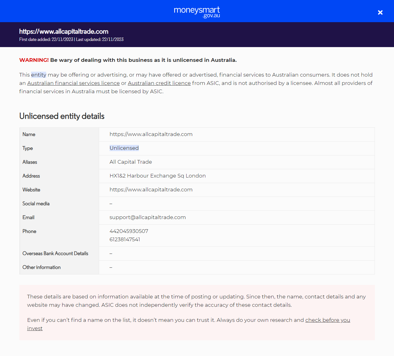 JenisMenawarkan layanan keuangan (termasuk produk keuangan) kepada orang-orang di Australia tanpa izin. Mereka tidak memiliki lisensi layanan keuangan Australia (AFS) atau lisensi kredit Australia dari ASIC.