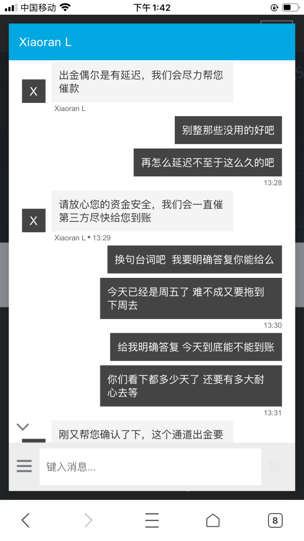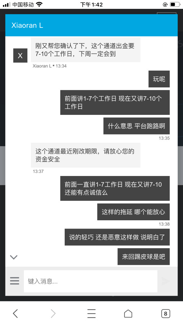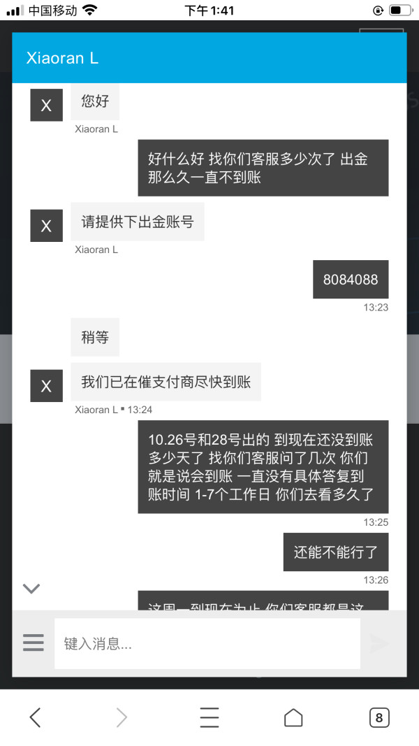 10.26号和28号出金两笔到现在一直没有到账 客服这边一直讲通道是1-7个工作日到账 等了那么久 现在客户又讲7-10的工作日 明显是恶意拖延 还是故意为之 之前出金都是正常的 找他们客服多次 给的回复就是一定会到账 问题是等的太久了 现在讲还要等 到底是平台出了问题还是什么情况