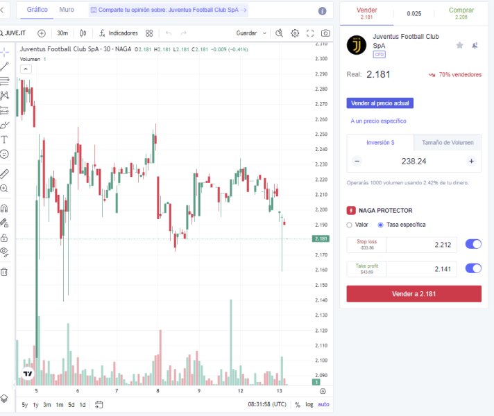 La plataforma de Naga es una de las características que más me gusta. Es como operar con la máxima comodidad. Incluso puedo operar con las acciones de mis equipos de fútbol favoritos. Al operar, es genial ya que muestra las tendencias actuales, también calcula cuánto de tu depósito estás usando basado en los lotes que pones. Además, el sistema de stop loss y take profit está cuidadosamente pensado. Tradingview está bien, hay instrumentos de sobra.