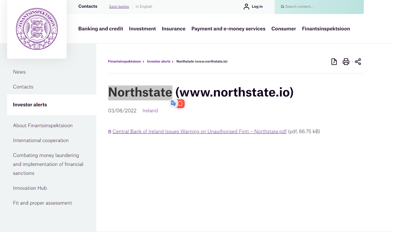 Avviso per gli investitori Finantsinspektsioon Avviso per gli investitori - Northstate (www.northstate.io) 03/08/2022 Irlanda.