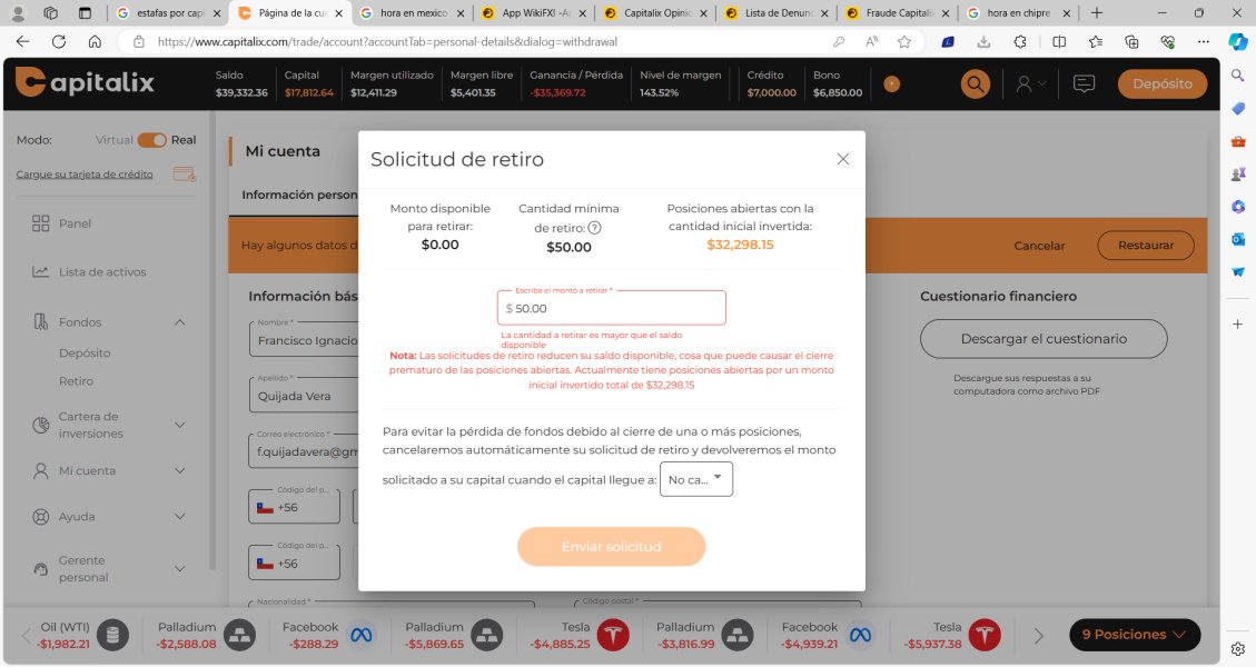 Buenas tardes quisiera exponer a Capitalix, no me dejan retirar mi dinero y me dicen que necesito un margen requerido de 12.000 dólares para poder retirar y que por lo tanto debo depositar dinero, lo curioso es que al principio me pedían 4 mil dólares, luego me dijeron que el mercado fluctúa entonces ahora necesito depositar más capital, exactamente unos 10 mil dólares a lo cual les dije que no tenía más, después recibí otro llamado en el cual me decían que ahora sólo necesitaba 2.500 dólares pero que tenía que hacerlo en un máximo de 2 horas y podía retirar mi dinero, y lo hicimos para que después me dijeran que necesitaba 7 mil más, son un chiste.