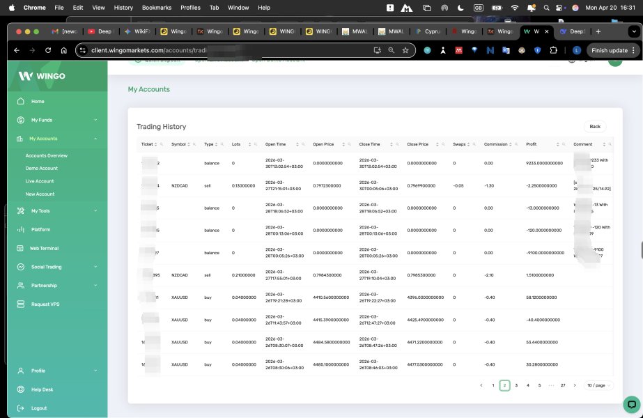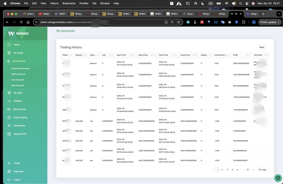 I am filing a formal complaint against Wingo for unauthorized fund transfers and account termination. I originally deposited USD via Volet as explicitly instructed by the broker. However, Wingo later moved my funds from my private wallet to their own internal wallet without my consent. This occurred immediately after I refused a forced cryptocurrency withdrawal, as I wanted to maintain standard banking protections and anti-fraud safeguards. I have provided full documentation and transaction paths , which Wingo acknowledged via email. Despite this, the broker began making unreasonable demands for 2025–2026 tax receipts—documents that are irrelevant to the initial deposit verification. Only two days after I formally declined the forced crypto withdrawal for the third time, Wingo closed my two trading accounts without notice. My access to MetaTrader and my remaining funds is now completely blocked. I have preserved all evidence and am reporting this to warn others.