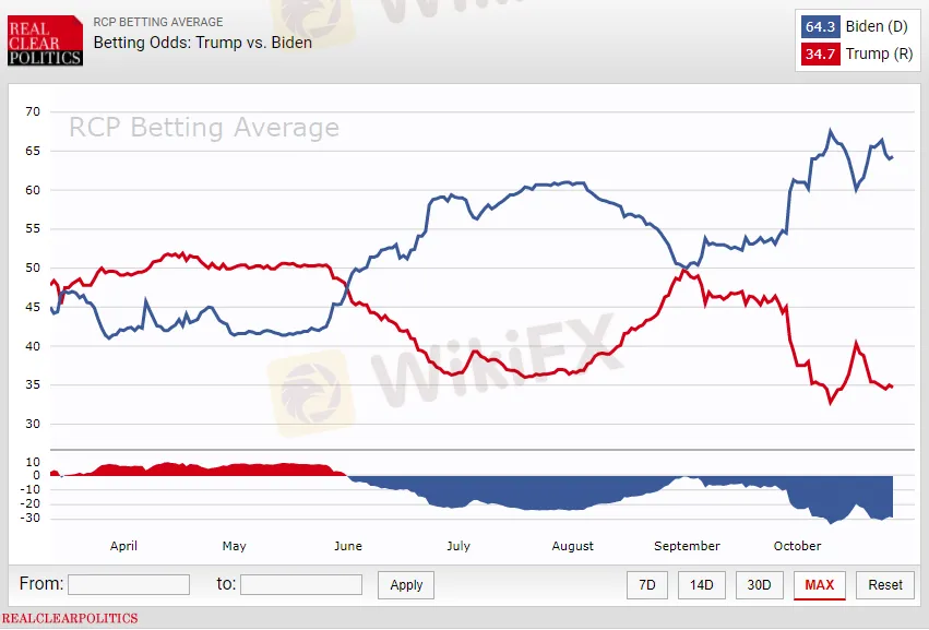 Falta apenas 6 dias para a eleição. A volatilidade do mercado começou a aumentar, mas isso não parece ser causado por fatores políticos. É mais provável que o aumento dos novos casos da epidemia. No momento, as chances dos dois candidatos e os dados das pesquisas de diferentes agências acreditam que o candidato democrata Biden vencerá, enquanto o atual presidente Trump está atrás de seu oponente.