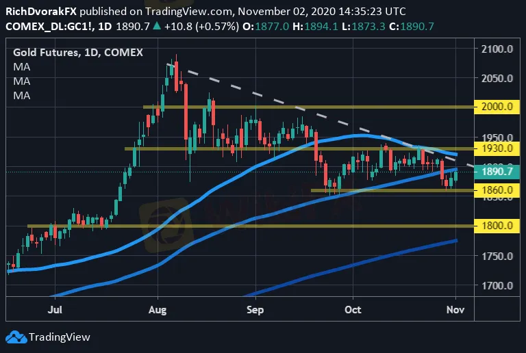 No início da semana, o comércio de ouro ganhou impulso, tentando se recuperar da queda de 1,5% da semana passada. O preço do ouro está atualmente oscilando em torno de US$ 1.890 por onça, tendo se recuperado anteriormente do suporte técnico da baixa de cerca de US$ 1.860 atingida em setembro. Esta área pode continuar a fornecer uma faixa de suporte para a tendência futura dos preços do ouro.