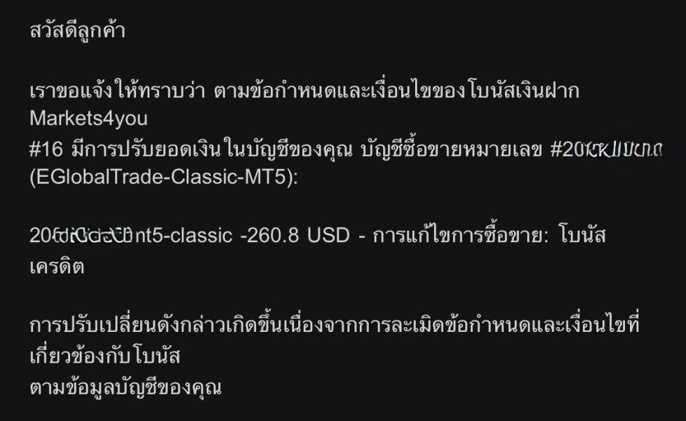 ฉันถูกโบรกเกอร์ Markets4you โกง ตัดเงินของฉันออก 260 $. ยอดเงินของฉันทั้งหมดคือ 821 $ แต่ให้ฉันทอนแค่ 560$. ไม่แจ้งรายละเอียด ว่าหักเงินของฉันทำไม. ทางโบรกเกอร์บอกว่าฉันทำผิดกฎ ฉันว่ามันเป็นข้ออ้างในการโกงลูกค้า ฉันเล่นโดยออก lot 0.02/ 0.03 เป็นครั้งแรกในการถอนก็มาหักเงินของฉันเลย โบรกเกอร์แย่มากห่วยแตก