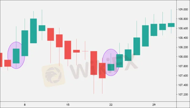 2. Зеленые свечи без нижней тени или фитиля указывают на сильный восходящий тренд.