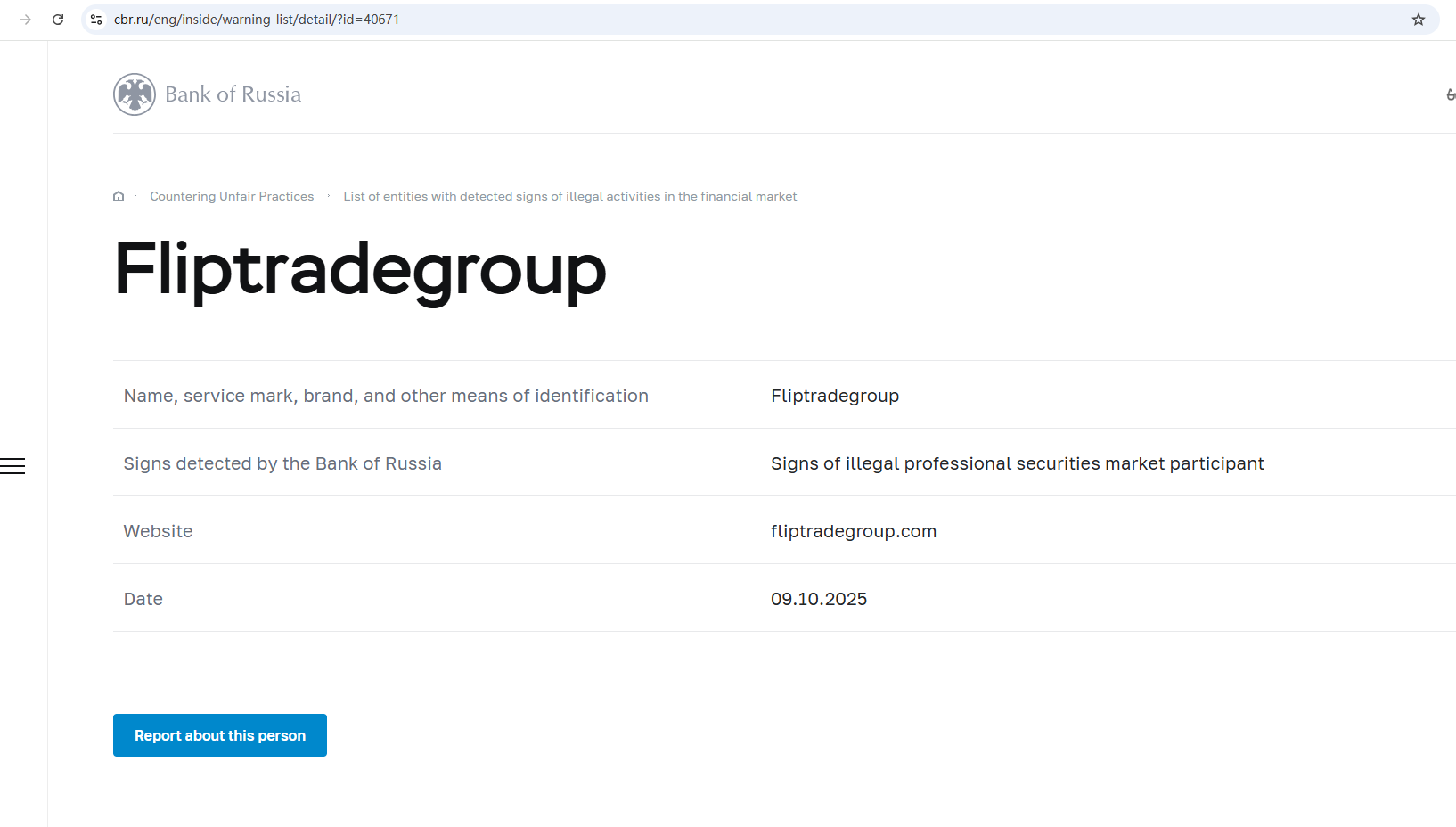 Название, знак обслуживания, торговая марка и другие средства идентификации Fliptradegroup Признаки, выявленные Банком России Признаки незаконного профессионального участника рынка ценных бумаг Веб-сайт fliptradegroup.com Дата 09.10.2025