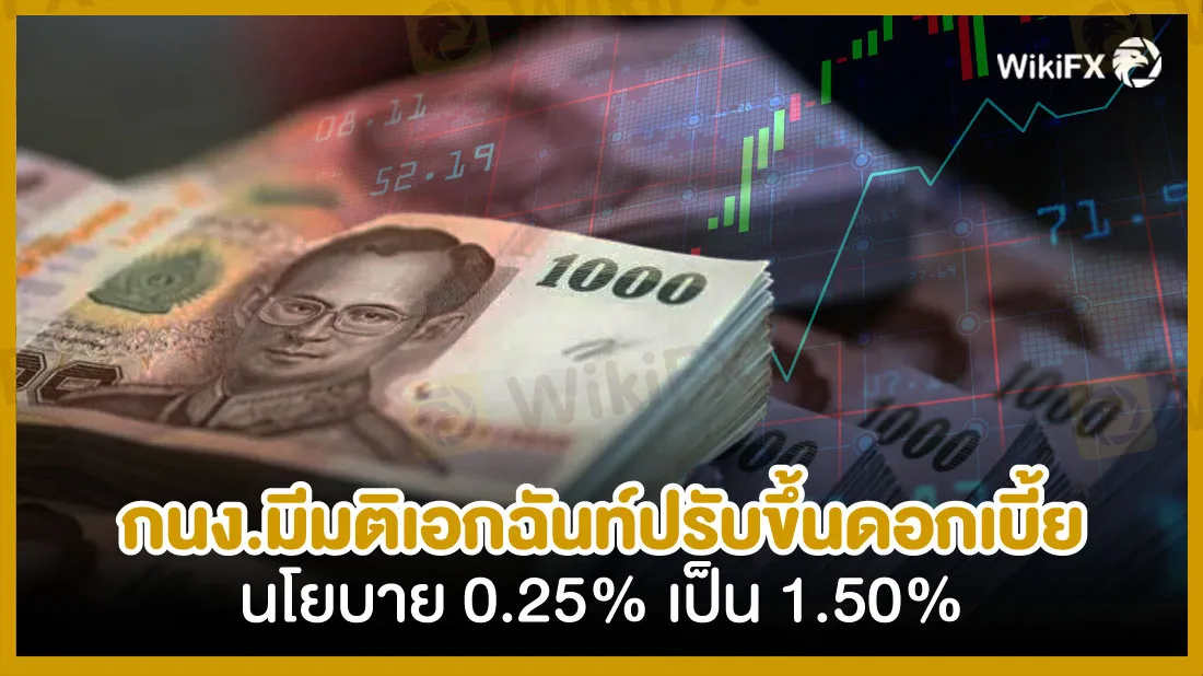 ที่ประชุมคณะกรรมการนโยบายการเงิน (กนง.) มีมติเป็นเอกฉันท์ให้ขึ้นอัตราดอกเบี้ยนโยบาย 0.25% ต่อปี จาก 1.25% เป็น 1.50% ต่อปี โดยให้มีผลทันที คณะกรรมการฯ เห็นว่าการทยอยปรับขึ้นอัตราดอกเบี้ยนโยบายอย่างต่อเนื่องเป็นแนวทางการดำเนินนโยบายที่สอดคล้องกับแนวโน้มการฟื้นตัวของเศรษฐกิจและเงินเฟ้อ