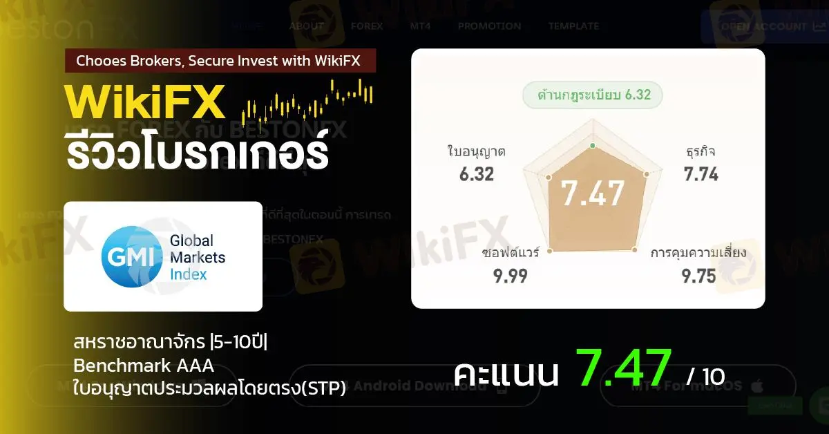GMI (Global Market Index) ก่อตั้งขึ้นเมื่อปี 2009 เป็นโบรกเกอร์สัญชาติอังกฤษ มีสำนักงานใหญ่ตั้งอยู่ที่กรุงลอนดอน ประเทศอังกฤษ และมีออฟฟิตอีกหลายๆ ประเทศ เช่น วานูอาตู, ฮ่องกง เป็นต้น มีการให้บริการเทรดสินค้าหลากหลาย อาทิ Forex, ทอง, น้ำมัน, โลหะเงิน, และดัชนี ส่วนในด้านของทางหน้าเว็บไซต์และ Customer Support มีภาษาไทยรองรับ