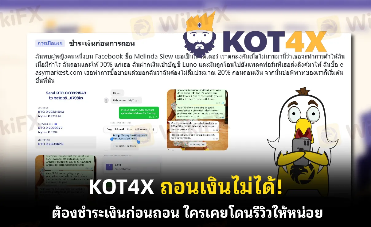 หลายคนที่เคยได้ยินชื่อ KOT4X อาจสนใจลองลงทุนเพราะโปรโมชั่นหรือเงื่อนไขเทรดที่น่าสนใจ แต่ปัญหาที่ถูกพูดถึงอย่างต่อเนื่องคือ การถอนเงินที่ไม่ราบรื่น บางรายถึงขั้นต้อง ชำระเงินเพิ่มเติมก่อนจึงจะสามารถถอนเงินได้ เรื่องนี้สร้างความกังวลให้กับนักเทรดจำนวนมาก และทำให้เกิดคำถามว่า KOT4X เชื่อถือได้จริงหรือไม่