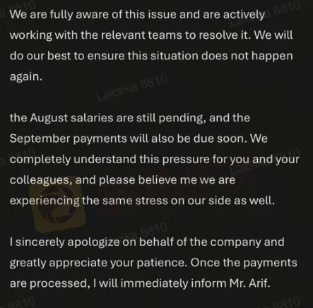 “เราทราบถึงปัญหานี้เป็นอย่างดี และกำลังดำเนินการร่วมกับทีมที่เกี่ยวข้องเพื่อหาทางแก้ไขอย่างเร่งด่วน... เงินเดือนของเดือนสิงหาคมยังคงค้างชำระอยู่ และกำหนดจ่ายของเดือนกันยายนก็กำลังจะมาถึง”