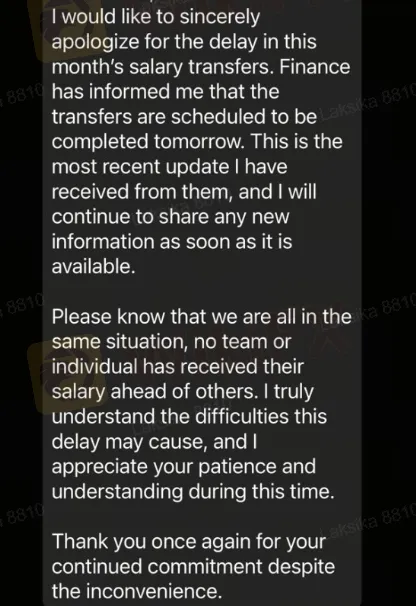 “ผมขอแสดงความเสียใจและขออภัยอย่างจริงใจต่อความล่าช้าในการโอนเงินเดือนของเดือนนี้... ไม่มีทีมใดหรือบุคคลใดได้รับเงินเดือนก่อนใคร ผมเข้าใจดีว่าความล่าช้านี้อาจสร้างความลำบากให้กับหลายคน”