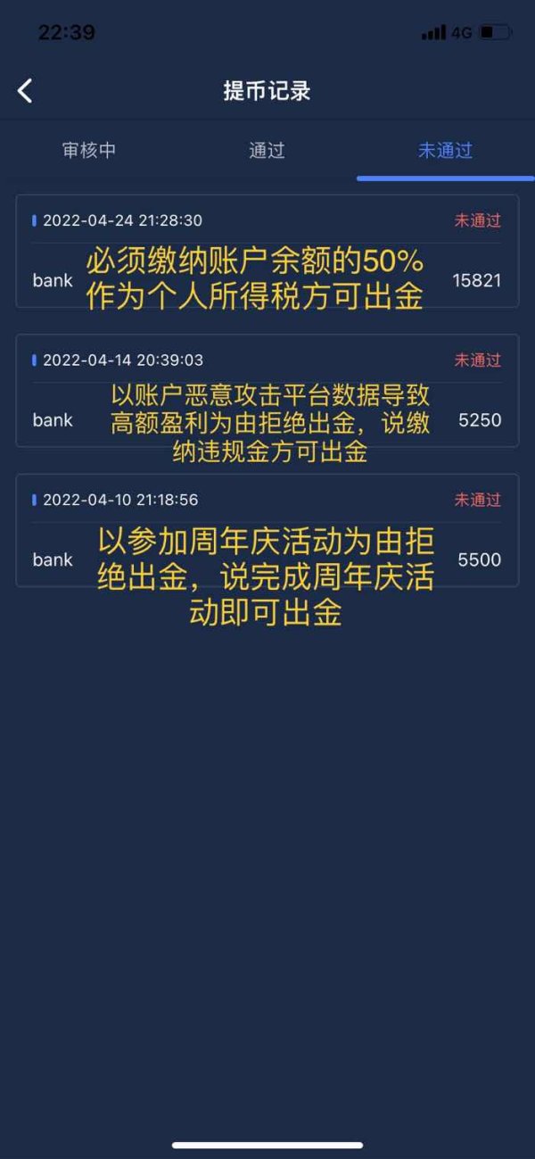 之前一步步诱导我入金,如今账户余额的75%都是我的本金,却说要缴纳账户余额的50%作为个人所得税才能恢复出金业务,咨询了日本这边的专业人士告诉我这样的要求是不合理的。我实在没钱了,为了平台周年庆活动和违规金已经向朋友借了94万日元,现在朋友也没钱再借给我缴纳税了,希望平台可以帮我讨个说法。