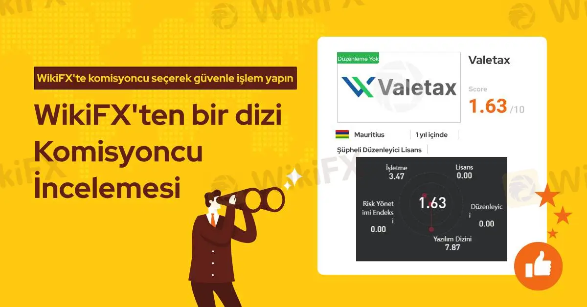 Valetax resmi lisans sahibi bir forex komisyoncusu değildir ve WikiFX araştırmalarına göre bu firmanın lisansı geçerli değildir. Ayrıca bu firmayla ilgili olarak son 3 ayda 5 farklı şikayet WikiFX yetkililerine ulaşmıştır. Bundan dolayı WikiFX bu komisyoncuya 1.63/10 gibi düşük seviye bir puan vermiştir.