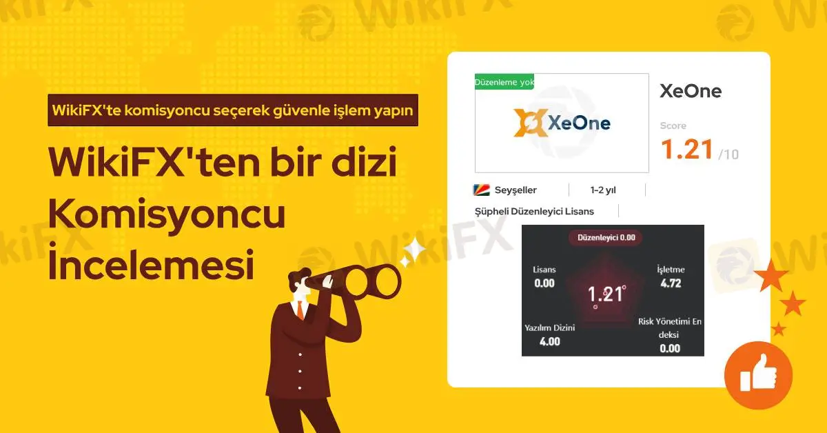XeOne resmi lisans sahibi bir forex komisyoncusu değildir ve WikiFX araştırmalarına göre bu firmanın lisansı geçerli değildir. Ayrıca bu firmayla ilgili olarak son 3 ayda 27 farklı şikayet WikiFX yetkililerine ulaşmıştır. Bundan dolayı WikiFX bu komisyoncuya 1.21/10 gibi düşük seviye bir puan vermiştir.