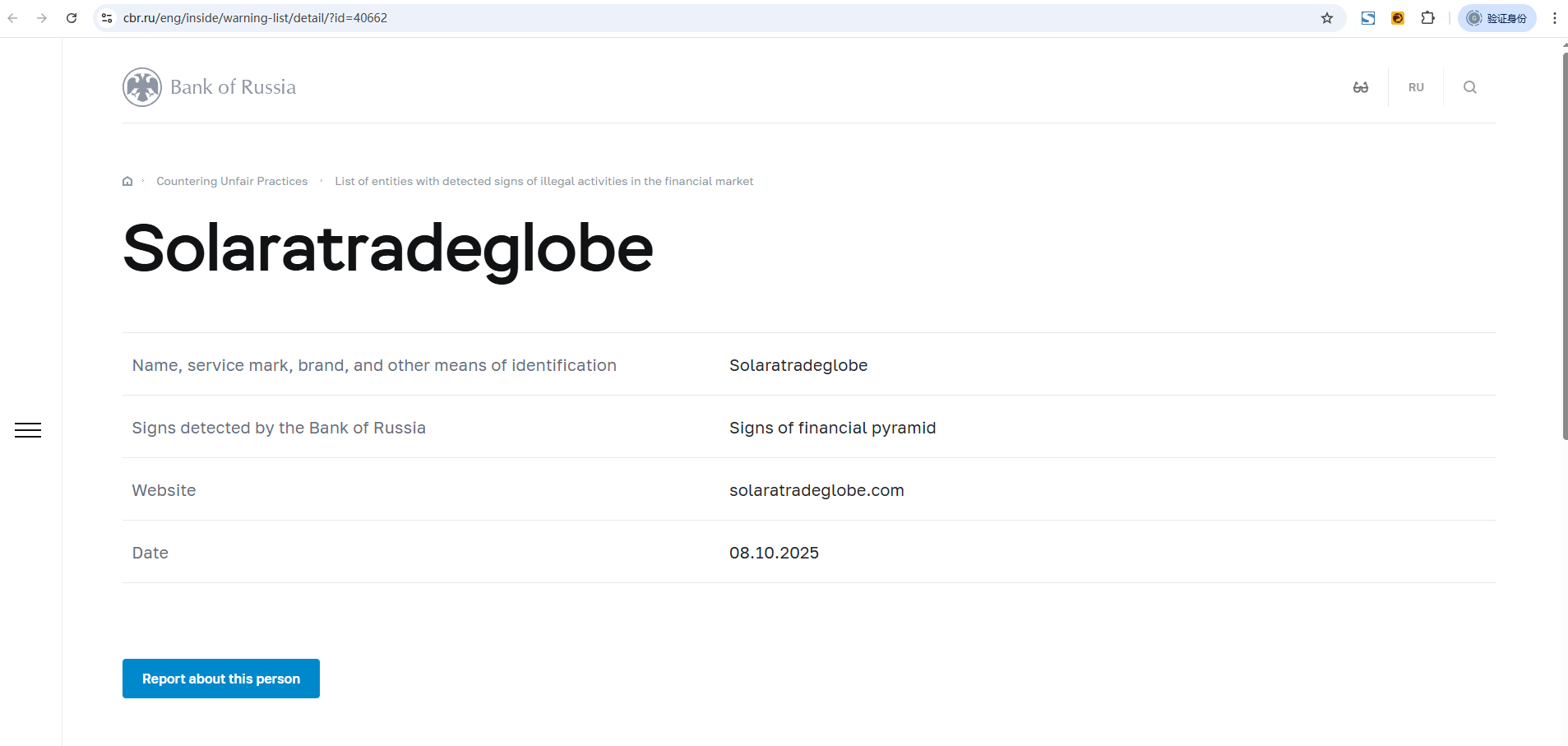 Ad, hizmet markası, marka ve diğer tanımlama araçları Solaratradeglobe Rusya Bankası tarafından tespit edilen işaretler Finansal piramit işaretleri Web sitesi solaratradeglobe.com Tarih 08.10.2025.