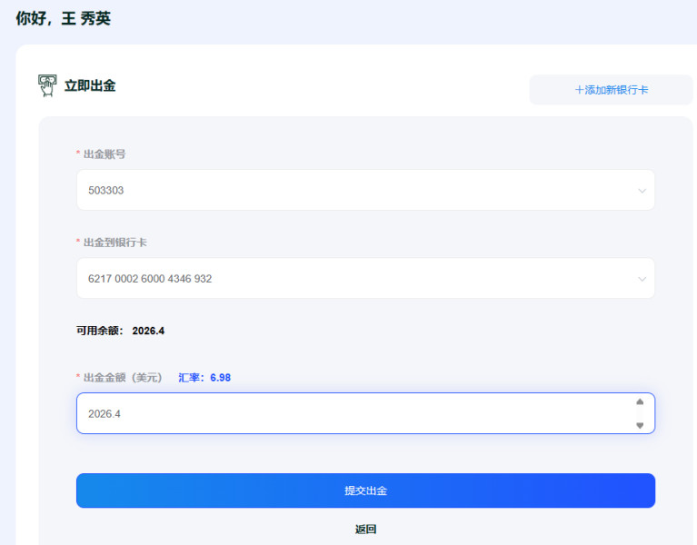 今天下午我的客户姓名:王秀英,账号:503303申请出金2026.4美金,客服拒绝出金。
