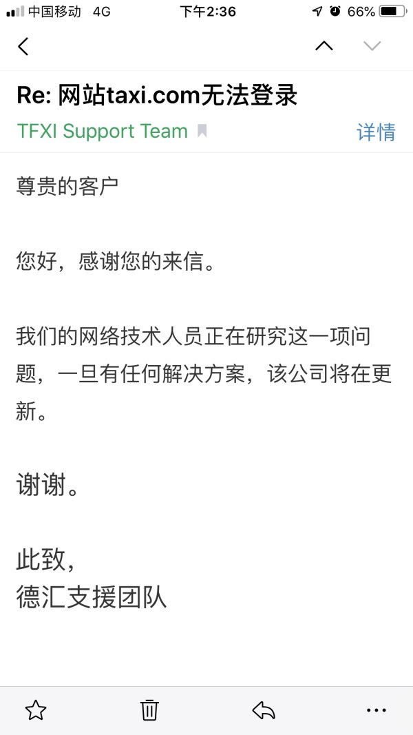 德汇交易平台(tfxi.com)不知怎么回事?我7月19号申请出金一万多美金,至今石沉大海,奇怪的是近一个月以来连网站也打不开了。发邮件也不回复!(最后一次回复邮件是10月4日,我发给他们的邮件中将网址tfxi.com输错成taxi.com,他们也没有纠正),我和家人共有23,000美元在此平台,怎么办啊!